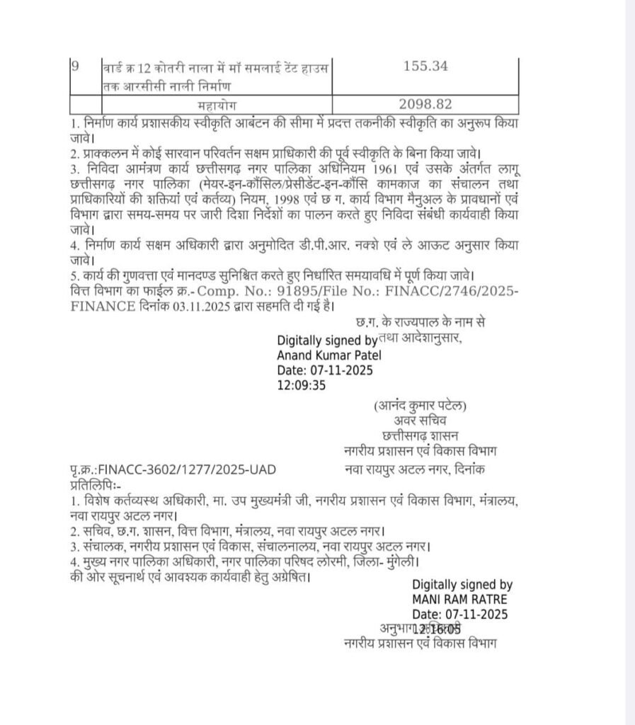 लोरमी : नगरीय प्रशासन एवं विकास विभाग ने लोरमी नगर पालिका परिषद के विभिन्न अधोसंरचना विकास कार्यों के लिए 20.98 करोड़ रुपये (2098.82 लाख रुपये) की राशि स्वीकृत की है। यह ऐतिहासिक स्वीकृति राज्य के उपमुख्यमंत्री एवं नगरीय प्रशासन मंत्री अरुण साव के अथक प्रयासों का परिणाम है, जिन्हें स्थानीय विधायक के रूप में भी जाना जाता है।