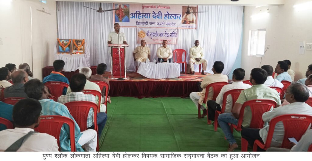 आरंगः बुधवार को श्री सुदर्शन जन सेवा समिति के तत्वाधान में साहू छात्रावास के सभागार में पुण्य श्लोक लोकमाता राजमाता अहिल्यादेवी होलकर के त्रीशताब्दी जन्म जयंती समारोह के अवसर पर सद्भावना बैठक का आयोजन किया गया। इस अवसर पर जिले एवं प्रांत से आए पदाधिकारी प्रशांत पांडे, ललित चंद्राकर, लोकनाथ साहू, देवेंद्र ठाकुर आदि ने अपने वक्तव्य में लोकमाता अहिल्यादेवी होलकर के जीवन वृत्त पर प्रकाश डालते हुए कहा कि साधारण से किस परिवार में जन्म लेकर मालवा प्रांत की महारानी बनने का उनका सफर समाज को नई दिशा दिखाता है।
