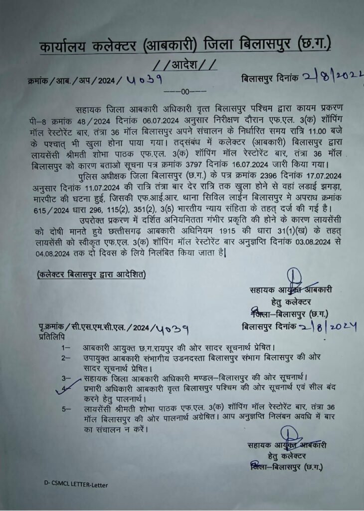 बिलासपुर के आबकारी विभाग द्वारा 36 मॉल का औचक निरीक्षण किया गया जिसमें स्पष्ट किया गया है कि शॉपिंग मॉल रेस्ट्रो बार, दुकान क्रमांक 36, मॉल बिलासपुर, ने निर्धारित समय सीमा का उल्लंघन किया है। 11.07.2024 को रात 11:00 बजे के बाद भी बार खुला पाया गया था, जो छत्तीसगढ़ आबकारी अधिनियम 1915 की धारा 31(1) का गंभीर उल्लंघन है।
