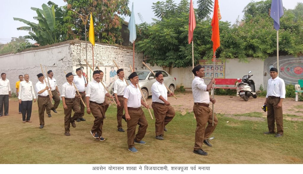 आरंगः अग्रसेन योगासन शाखा अग्रवाल पारा आरंग द्वारा मंगलवार को विजयादशमी, शस्त्रपूजा पर्व हर्षोल्लास के साथ मनाया गया। कार्यक्रम का शुभारंभ मुख्य अतिथि राजेश साहू, अध्यक्षता शंकर पाल, मुख्यवक्ता अनुपनाथ योगी एवं रामु मिर्धा द्वारा शस्त्र, भारत माता, डॉक्टर केशव बलिराम हेडगेवार व सदाशिव गोलवरकर गुरू जी की छायाचित्र पर पूजा अर्चना एवं दीप प्रज्वलित कर किया गया। मुख्य अतिथि राजेश साहू ने अपने उदबोधन में कहा की राष्ट्रीय स्वयंसेवक संघ देश की परिस्थिति को देख कर समाज को जगाने राष्ट्र के लिए काम कर रहा है। पहले आरंग राष्ट्रीय स्वयंसेवक का प्रमुख केन्द्र था, जो कुछ समय से सुप्त अवस्था मे था लेकिन आज अग्रसेन योगासन शाखा नियमित रूप से लग रहा है जो प्रशंसनीय है, यही शाखा की परिभाषा है। वहीं अध्यक्षता कर रहे शंकर पाल ने कहा कि भगवान राम ने असुरी शक्ति को पराजित करने के पहले नव देवी जो दुर्गा के रूप में है उसकी अराधना, पूजा की और उनसे शक्ति प्राप्त कर अहंकारी रावण का वध किया, जो असत्य पर सत्य का जीत था।