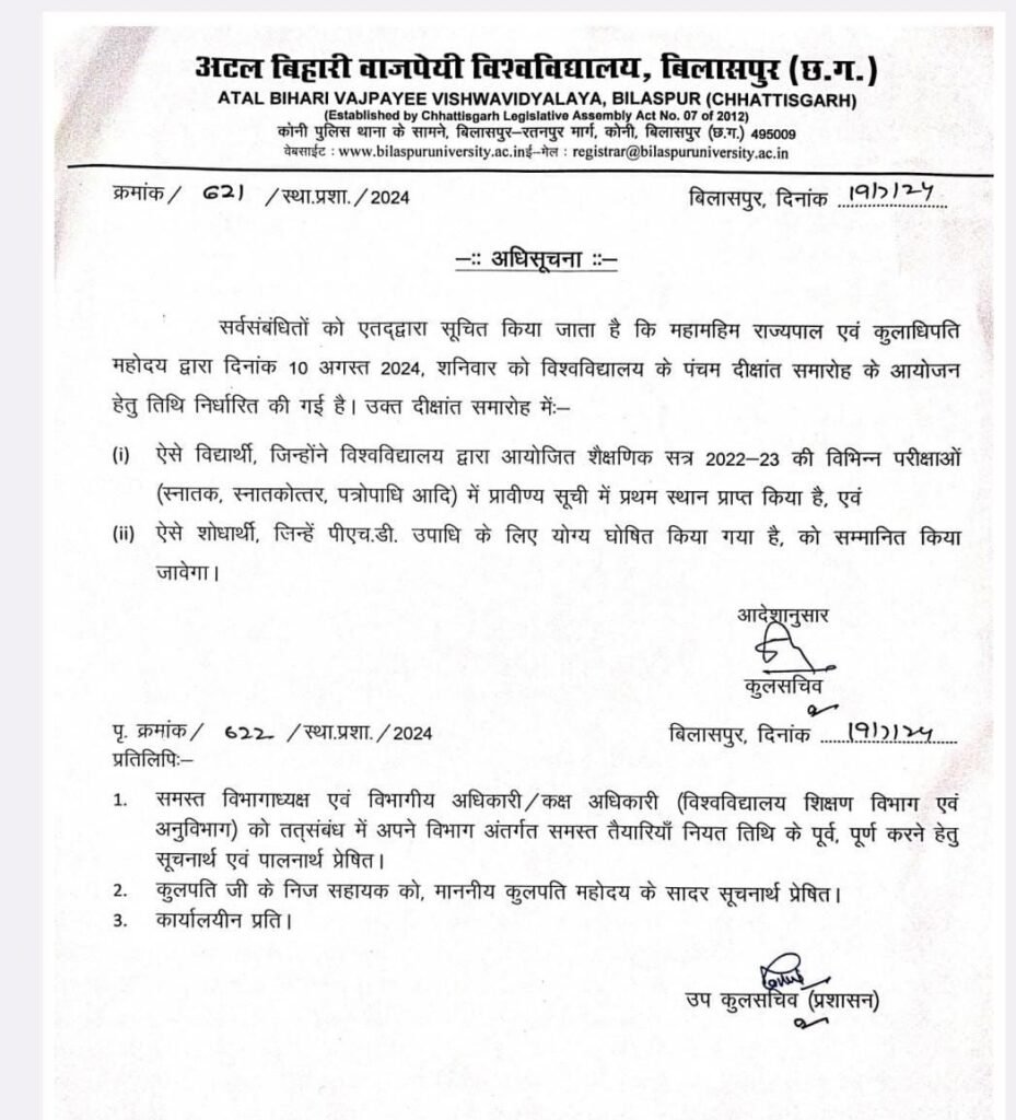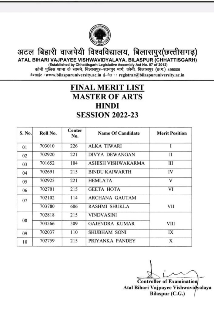 बिलासपुर साई धाम निवासी कुशल गृहिणी अलका तिवारी ने अटल बिहारी वाजपेयी विश्वविद्यालय की एम हिंदी की प्रावीण्य सूची में प्रथम स्थान प्राप्त किया है। अलका को विश्वविद्यालय के पंचम दीक्षांत समारोह में 10 अगस्त को स्वर्ण पदक से सम्मानित किया जाएगा। आरंभ से मेधावी छात्रा रही अलका तिवारी ने बीएलटी महाविद्यालय रतनपुर से एम ए हिंदी की परीक्षा स्वाध्यायी छात्रा के रूप में दी थी।