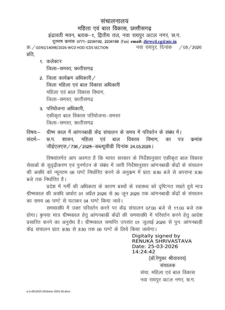 आदेश के मुताबिक अब आंगनबाड़ी केंद्र सुबह 7 बजे से 11 बजे तक ही संचालित होंगे। पहले करीब 6 घंटे चलते थे, लेकिन अब समय घटाकर 4 घंटे कर दिया गया है, ताकि छोटे बच्चों को तेज धूप और गर्मी से बचाया जा सके।
