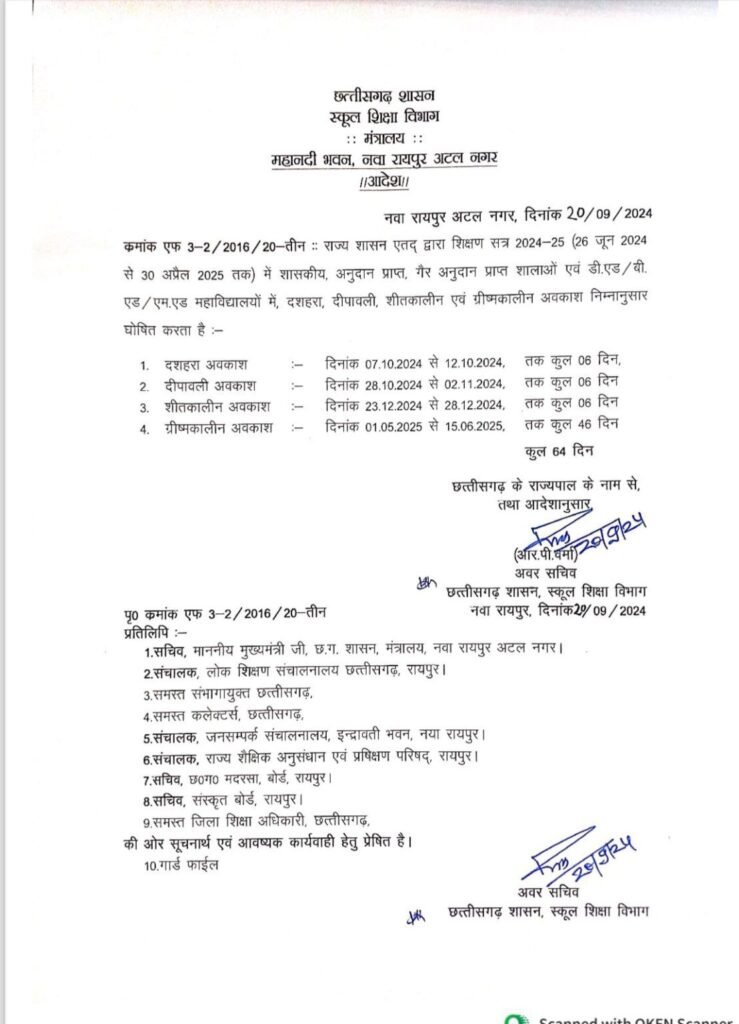 रायपुर : स्कूल शिक्षा विभाग ने शिक्षा सत्र 2024-25 के लिए 64 दिनों की छुट्टियों की घोषणा की है। इस बार दशहरा और दीपावली के लिए 6-6 दिन का अवकाश रहेगा.