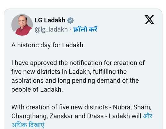 उपराज्यपाल वी के सक्सेना ने एक्स पर एक पोस्ट में लिखा, “लद्दाख के लिए एक ऐतिहासिक दिन। मैंने लद्दाख में पांच नए जिलों के गठन की अधिसूचना को मंजूरी दे दी है, जिससे लद्दाख के लोगों की आकांक्षाओं और लंबे समय से लंबित मांग को पूरा किया जा रहा है।