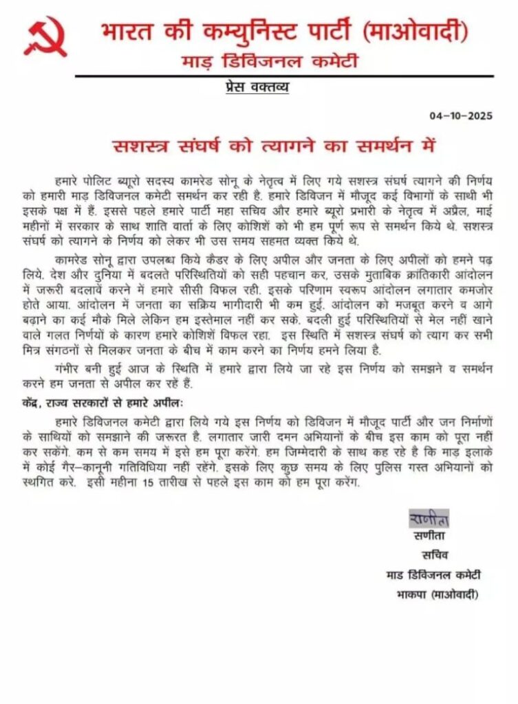 नए पत्र में माड़ डिविजन कमेटी ने स्पष्ट किया है कि 15 अक्टूबर तक संगठन के सदस्य हथियार डाल देंगे। पत्र में इसका कारण पुलिस के बढ़ते दबाव और जनता से घटते समर्थन को बताया गया है।
