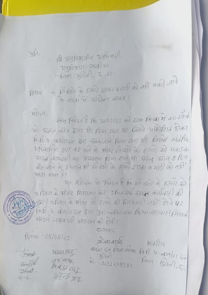 ज्ञापन सौंपने के दौरान संगठन के कार्यकर्ताओं ने मांग की कि गौवंशों की निर्मम हत्या के मामले में त्वरित कार्रवाई की जाए ताकि दोषी को सजा मिल सके और भविष्य में ऐसी घटनाएं न हों।