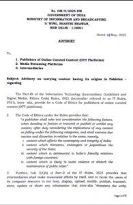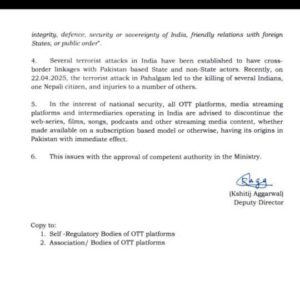 राष्ट्रीय सुरक्षा के हित में, भारत में चलने वाली सभी ओटीटी प्लेटफॉर्म, मीडिया स्ट्रीमिंग सेवाओं और इंटरमीडियरीज को निर्देश दिया गया है कि वे तुरंत प्रभाव से पाकिस्तान से ताल्लुक रखने वाले वेब-सीरीज, फिल्में, गाने, पॉडकास्ट और अन्य स्ट्रीमिंग मीडिया सामग्री को बंद करें।