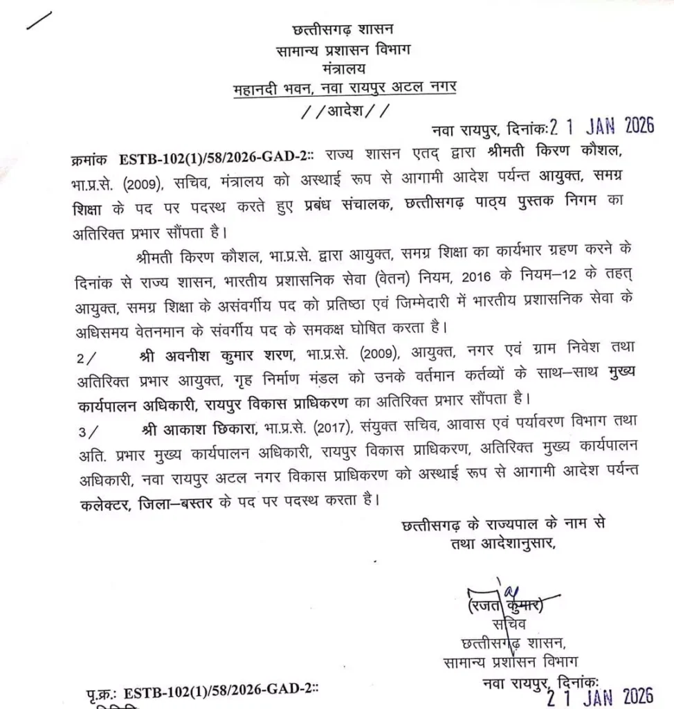 इसके साथ ही शासन ने दो अन्य आईएएस अधिकारियों को अतिरिक्त प्रभार भी सौंपा है। आईएएस अवनीश शरण और आईएएस किरण कौशल को अतिरिक्त जिम्मेदारियां दी गई हैं। इस प्रशासनिक बदलाव को शासन स्तर पर कार्यों की सुचारू व्यवस्था और प्रशासनिक मजबूती के उद्देश्य से किया गया है।