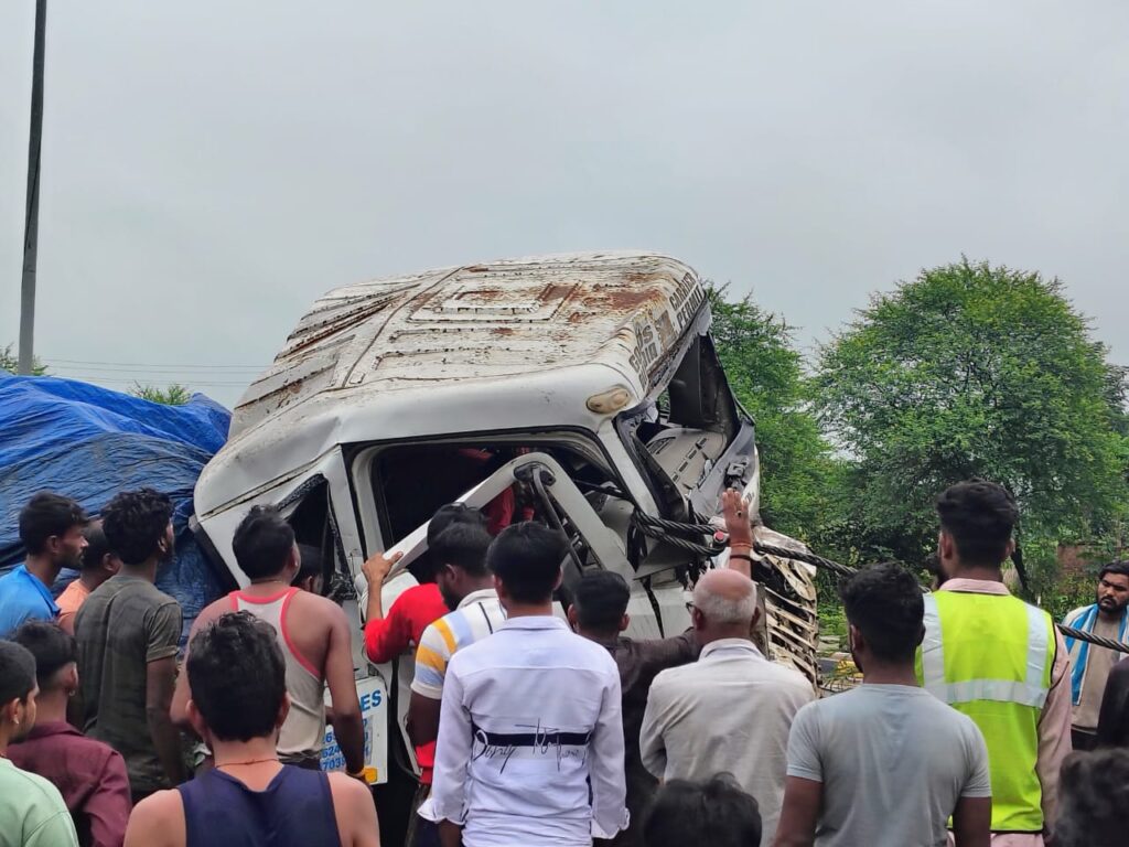 तेज रफ्तार ओवरलोड ट्रेलर ब्रेकर पर चढ़ा, नशे में धुत ड्राइवर भीड़ ने बचाया