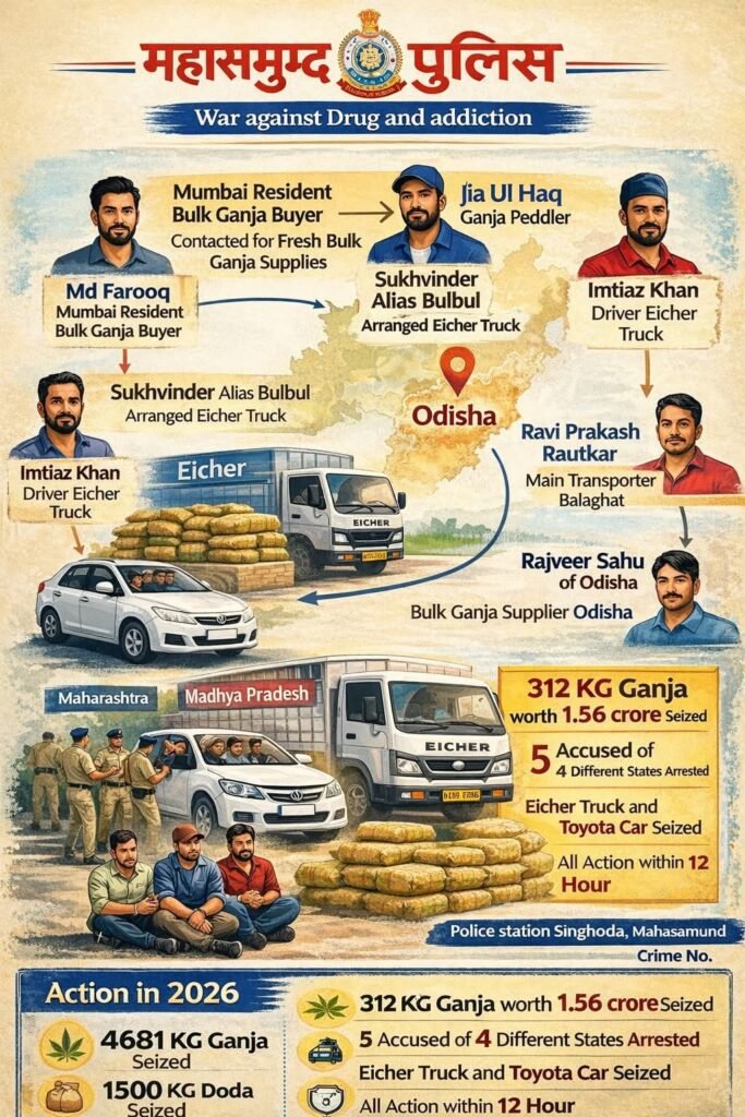 प्रारंभिक पूछताछ में खुलासा हुआ कि यह गांजा उड़ीसा के सोनपुर जिले से लाकर मुंबई (महाराष्ट्र) में खपाने की योजना थी। पुलिस ने तत्परता दिखाते हुए 12 घंटे के भीतर कार्रवाई को आगे बढ़ाया और ओडिशा के बरहमपुर से तीन थोक खरीददारों को भी गिरफ्तार कर लिया, जो बालाघाट, उत्तर प्रदेश और जम्मू के निवासी बताए जा रहे हैं।