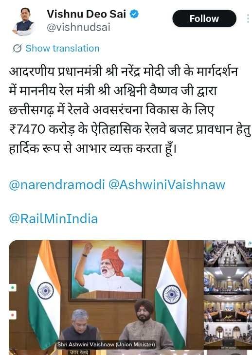 मुख्यमंत्री विष्णुदेव साय ने प्रधानमंत्री श्री नरेंद्र मोदी और रेल मंत्री श्री अश्विनी वैष्णव के प्रति किया आभार प्रकट