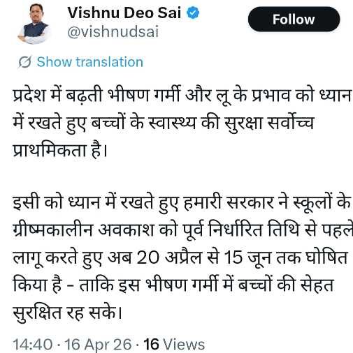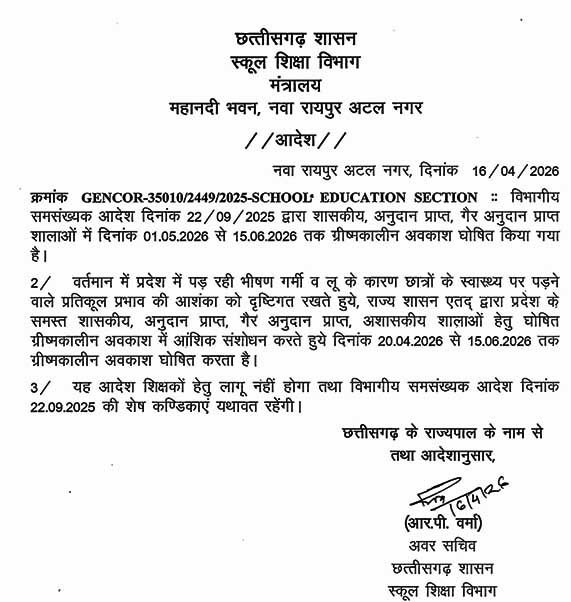 गौरतलब है कि बीते कुछ दिनों से रायपुर, बिलासपुर और दुर्ग सहित कई जिलों में तापमान 40 डिग्री सेल्सियस से अधिक दर्ज किया जा रहा है। अत्यधिक गर्मी के कारण बच्चों की तबीयत बिगड़ने की शिकायतें भी सामने आ रही थीं, जिसके चलते सरकार ने यह निर्णय लिया।