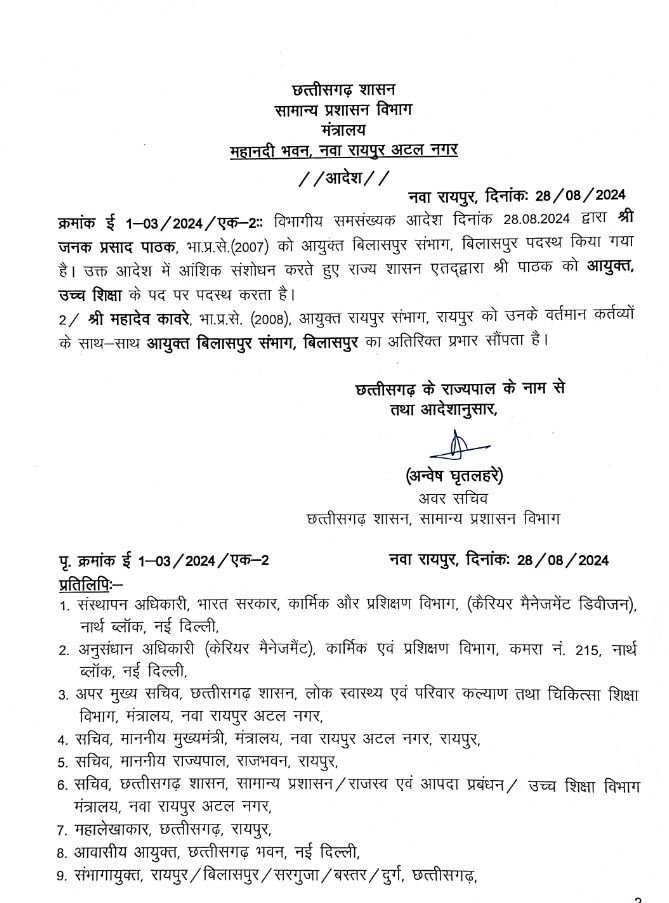 अब उस आदेश में संशोधन करते हुए जनक पाठक को आयुक्त उच्च शिक्षा बनाया गया है, वहीं महादेव कावरे को बिलासपुर कमिश्नर का एडिश्नल चार्ज दिया गया है।