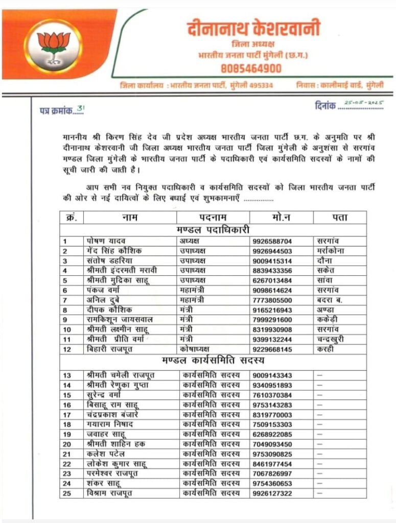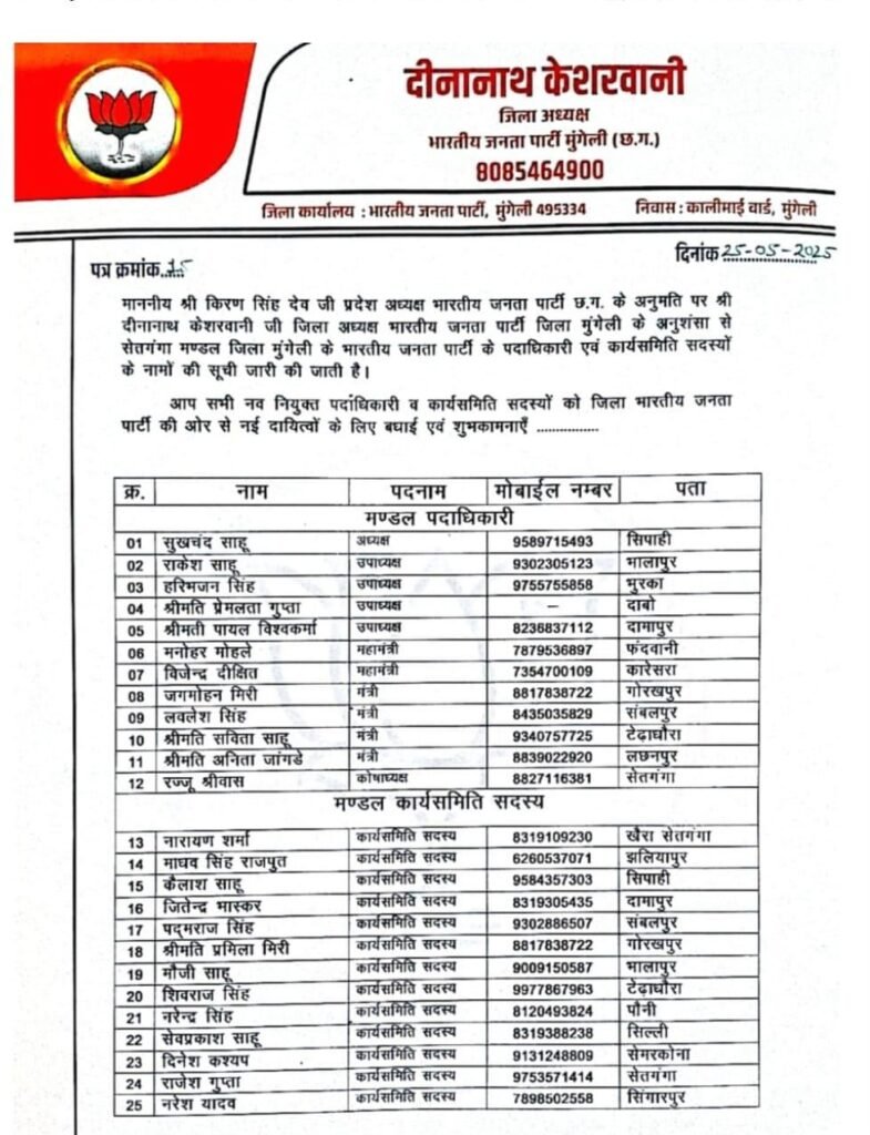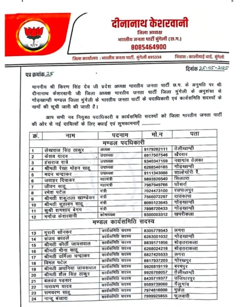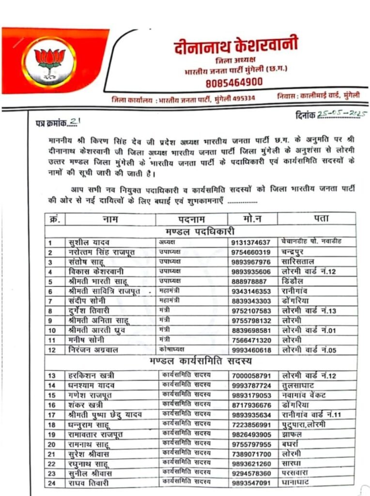 मुंगेली- प्रदेश अध्यक्ष किरण सिंह देव की अनुमति,उप मुख्यमंत्री एवं लोरमी विधायक अरूण साव,पूर्व विधानसभा अध्यक्ष एवं बिल्हा विधायक धरम लाल कौशिक, पूर्व मंत्री व मुंगेली विधायक पुन्नूलाल मोहले की सहमति ,भाजपा जिलाध्यक्ष दीनानाथ केशरवानी की अनुशंसा पर मुंगेली जिले के 11 मंडलों के पदाधिकारियों एवं कार्यकारिणी की घोषणा की गई है।
