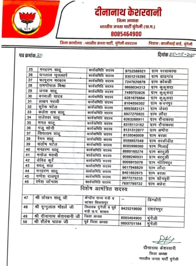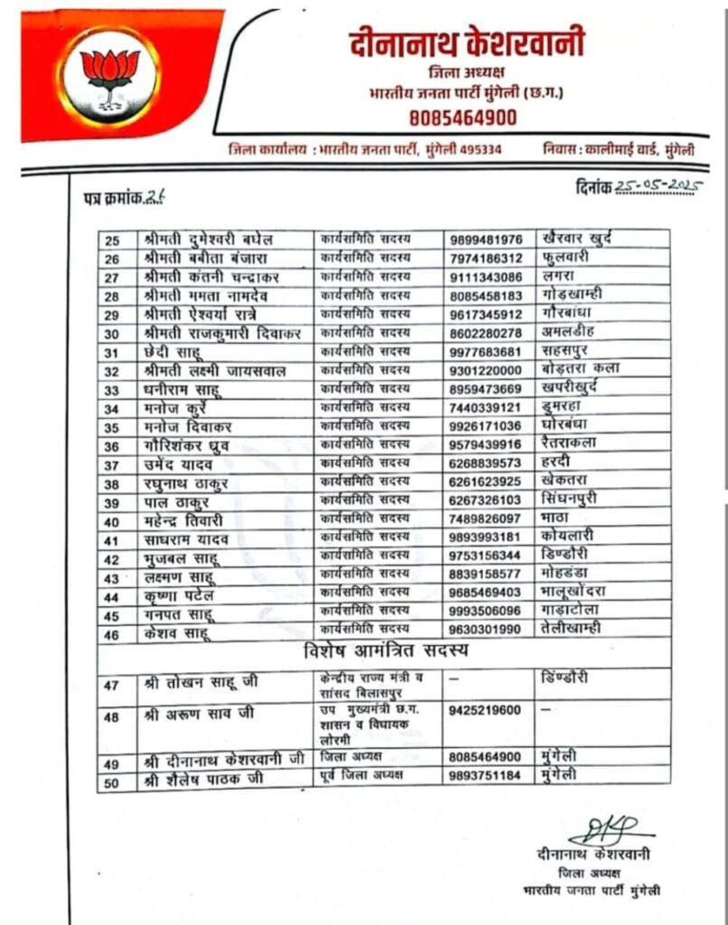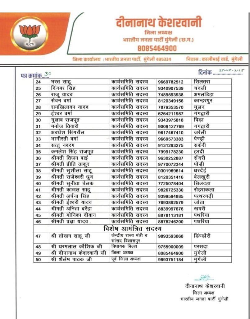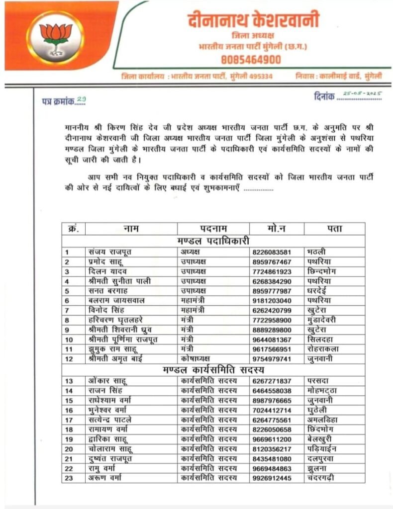 मुंगेली- प्रदेश अध्यक्ष किरण सिंह देव की अनुमति,उप मुख्यमंत्री एवं लोरमी विधायक अरूण साव,पूर्व विधानसभा अध्यक्ष एवं बिल्हा विधायक धरम लाल कौशिक, पूर्व मंत्री व मुंगेली विधायक पुन्नूलाल मोहले की सहमति ,भाजपा जिलाध्यक्ष दीनानाथ केशरवानी की अनुशंसा पर मुंगेली जिले के 11 मंडलों के पदाधिकारियों एवं कार्यकारिणी की घोषणा की गई है।