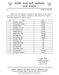 छत्तीसगढ़ भाजपा ने 3 जिलों में नई कार्यकारिणी का ऐलान कर दिया है। जिन जिलों की कार्यकारिणी गठित की गयी है, उसमें बालोद, दंतेवाड़ा और गरियाबंद जिला शामिल हैं। देखिये पूरी लिस्ट