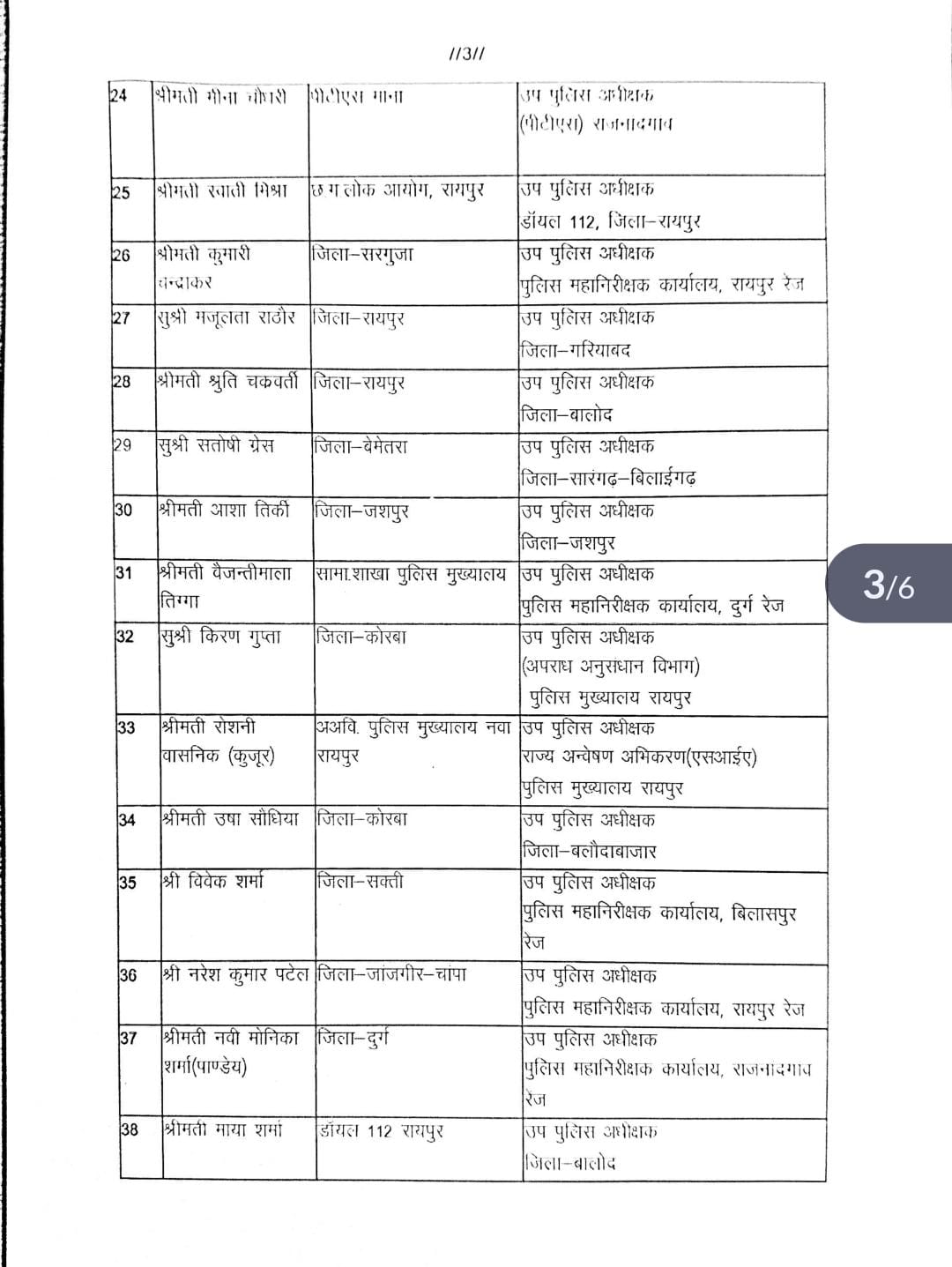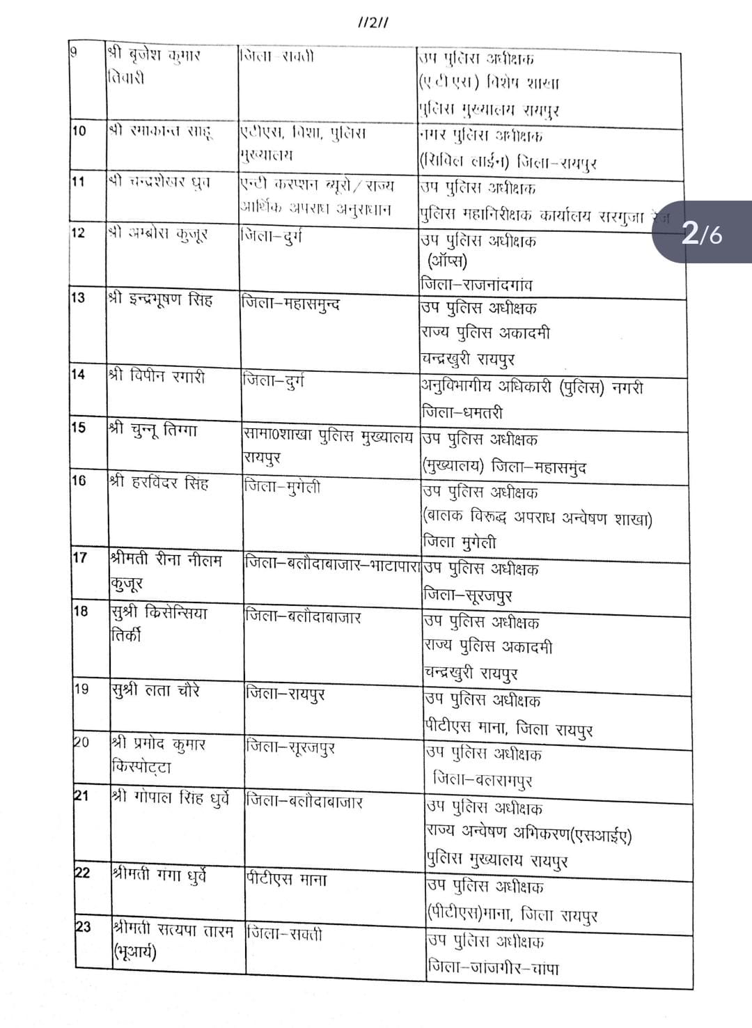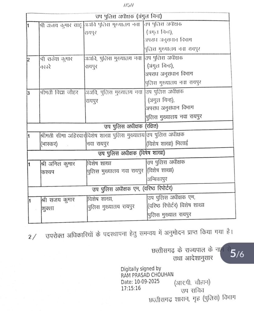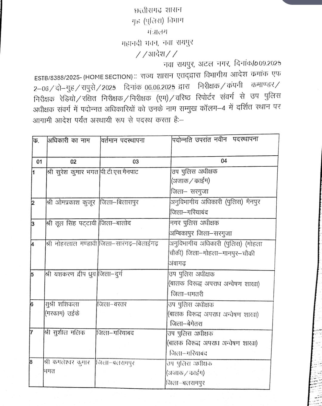 रायपुर। पुलिस विभाग में हाल ही में डीएसपी के पद पर पदोन्नत हुए अधिकारियों को नई पदस्थापना दे दी गई है। बता दें कि 6 जून 2025 को निरीक्षक, कंपनी कमांडर, निरीक्षक रेडियो और रक्षित निरीक्षक से उप पुलिस अधीक्षक (डीएसपी) संवर्ग में प्रमोशन पाने वाले अधिकारियों को पदस्थापना आदेश जारी कर दिया गया है।