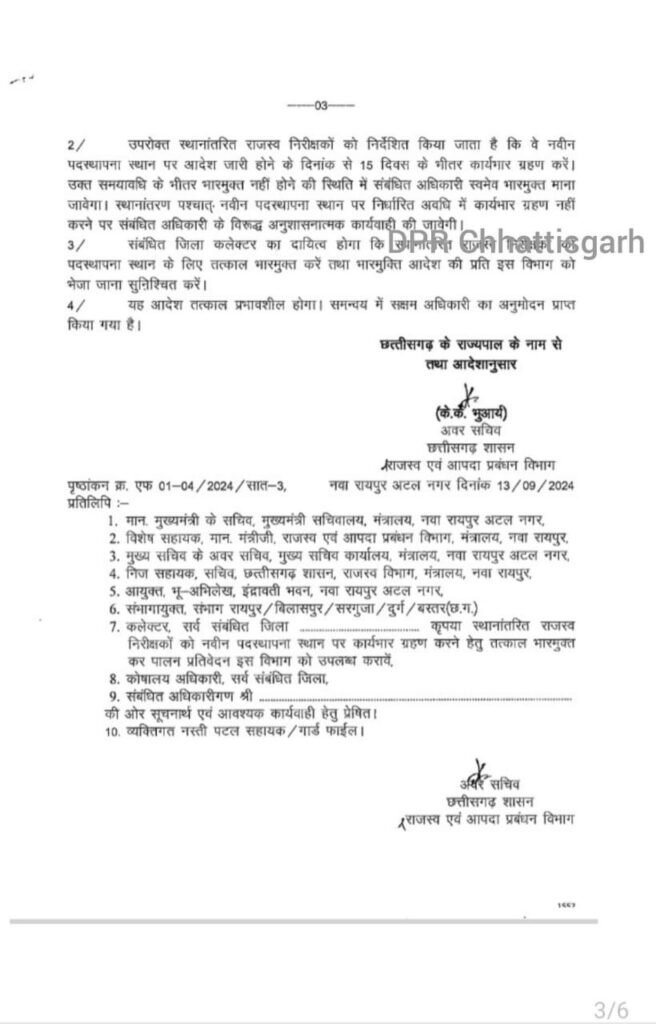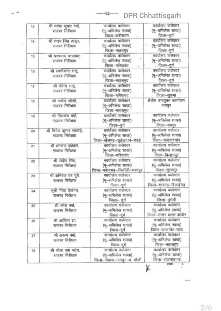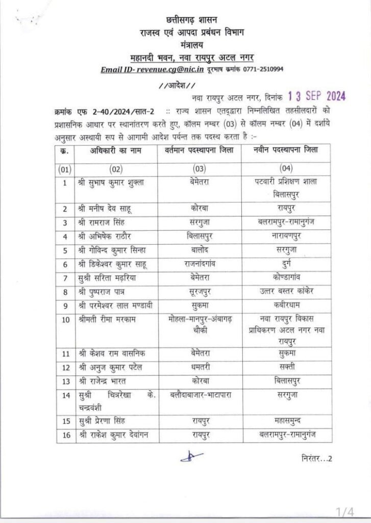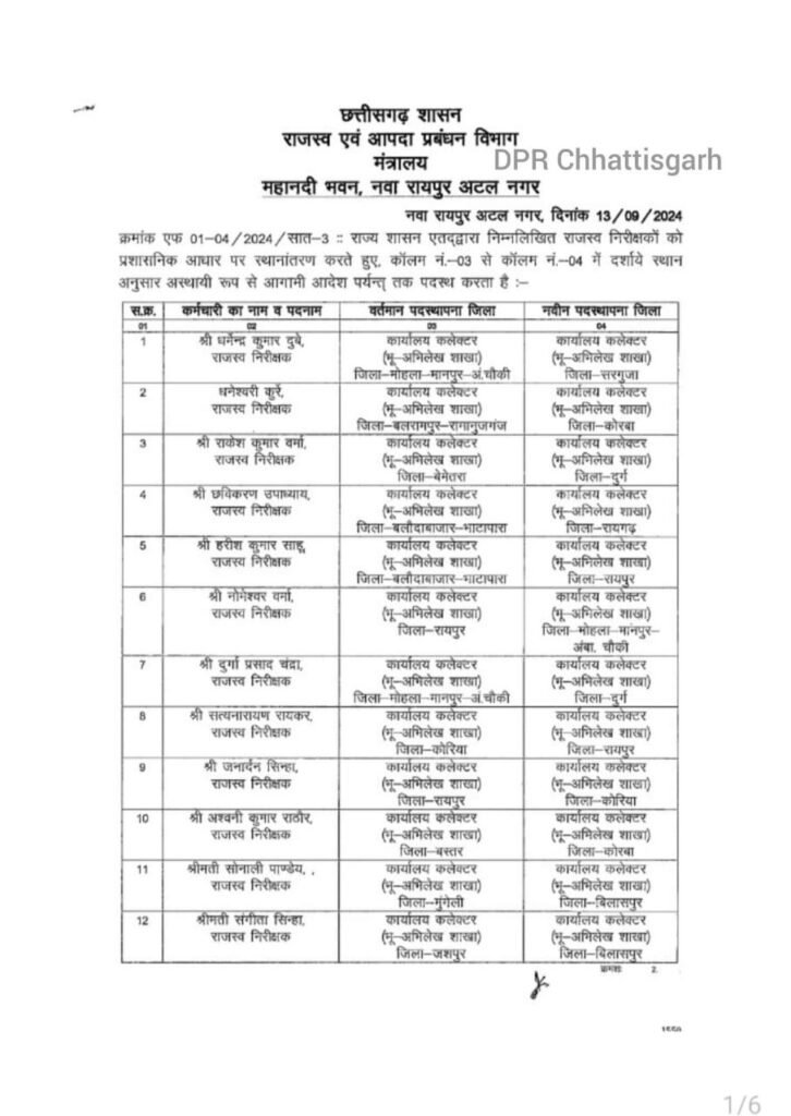 रायपुर : राज्य सरकार ने एक साथ थोक में तहसीलदारो का तबादला आदेश जारी किया है।
