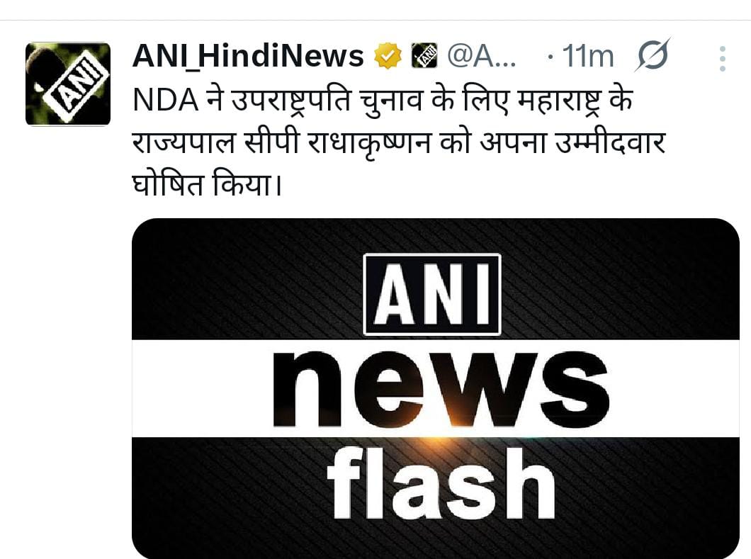 महाराष्ट्र के राज्यपाल सीपी राधाकृष्णन NDA के उपराष्ट्रपति पद के उम्मीदवार होंगे। रविवार को हुई भाजपा संसदीय दल की बैठक में उनके नाम पर सहमति बनी। नड्डा ने प्रेस कॉन्फ्रेंस कर राधाकृष्णन के नाम का ऐलान किया।