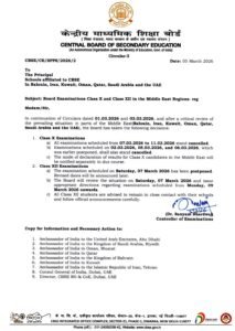 सीबीएसई द्वारा जारी सर्कुलर के अनुसार बहरीन, ईरान, कुवैत, ओमान, कतर, सऊदी अरब और संयुक्त अरब अमीरात में कक्षा 10 की 7 मार्च से 11 मार्च 2026 तक होने वाली सभी परीक्षाएं रद्द कर दी गई हैं। इसके अलावा 2 मार्च, 5 मार्च और 6 मार्च को होने वाली वे परीक्षाएं भी रद्द कर दी गई हैं जिन्हें पहले स्थगित किया गया था।