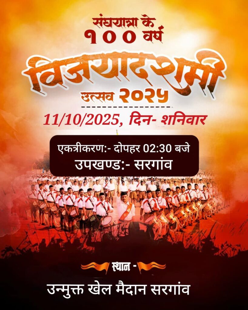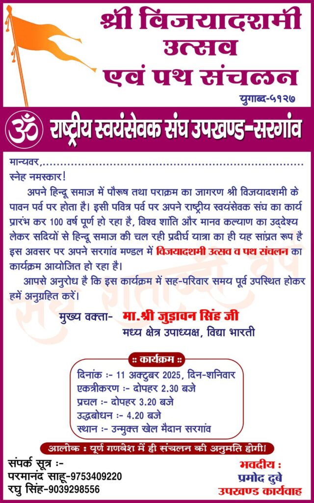 जो विश्व शांति और मानव कल्याण के उद्देश्य से सदियों पुरानी हिंदू समाज की यात्रा का समसामयिक रूप है।कार्यक्रम आज 11 अक्टूबर 2025, शनिवार को उन्मुक्त खेल मैदान, सरगांव में आयोजित होगा, जहां एकत्रीकरण दोपहर 2:30 बजे से प्रारंभ होकर पथ संचलन दोपहर 3:20 बजे चलेगा और मुख्य उद्बोधन 4:20 बजे होगा।
