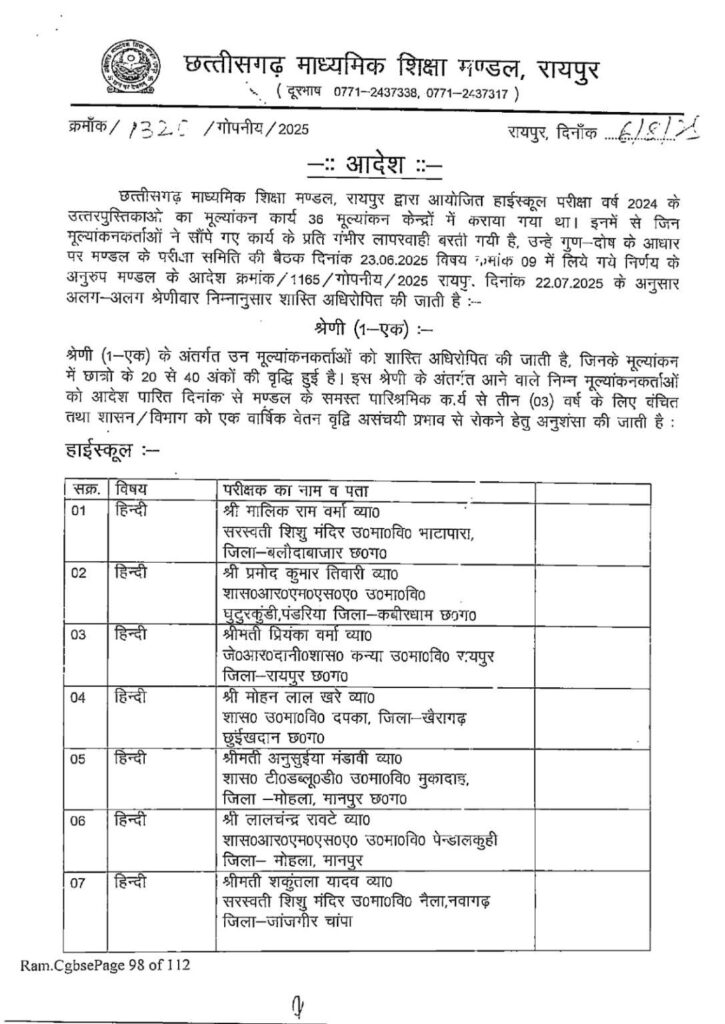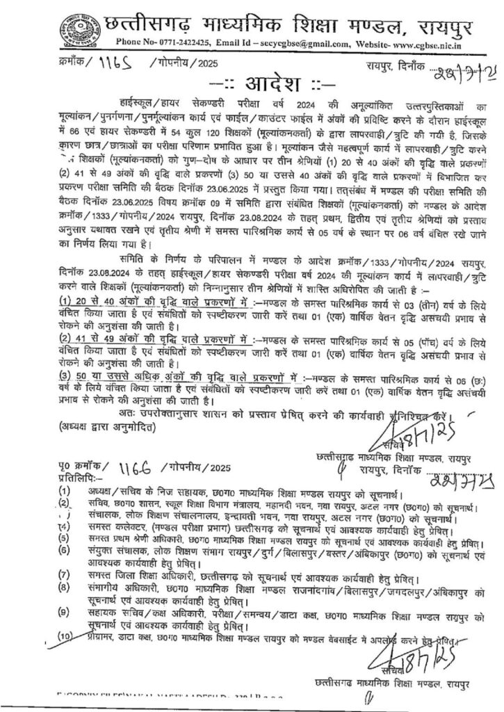 रायपुर। छत्तीसगढ़ माध्यमिक शिक्षा मंडल (सीजी बोर्ड) ने कक्षा 10वीं और 12वीं की उत्तर पुस्तिकाओं के मूल्यांकन में अनियमितता करने वाले 66 शिक्षकों पर कड़ी कार्रवाई की है। मंडल ने इन शिक्षकों पर 3 से 5 साल तक मूल्यांकन कार्य से प्रतिबंध और एक वार्षिक वेतनवृद्धि (इंक्रीमेंट) रोकने की अनुशंसा की है।