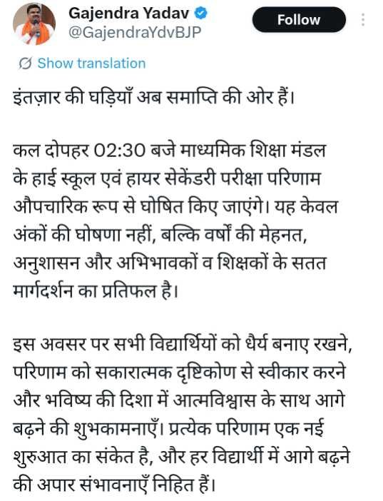 शिक्षा मंत्री यादव ने एक्स पर पोस्ट कर लिखा है कि इंतजार की घड़ियां अब समाप्ति की ओर है। बुधवार दोपहर 2:30 बजे माध्यमिक शिक्षा मंडल के हाईस्कूल एवं हायर सेकेंडरी परीक्षा परिणाम औपचारिक रूप से घोषित किए जाएंगे।