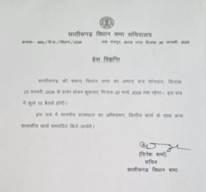 छत्तीसगढ़ विधानसभा के बजट सत्र की तारीख तय कर दी गई है. विधानसभा सचिवालय द्वारा जारी अधिसूचना के अनुसार, बजट सत्र 23 फरवरी से शुरू होगा और 20 मार्च तक चलेगा.