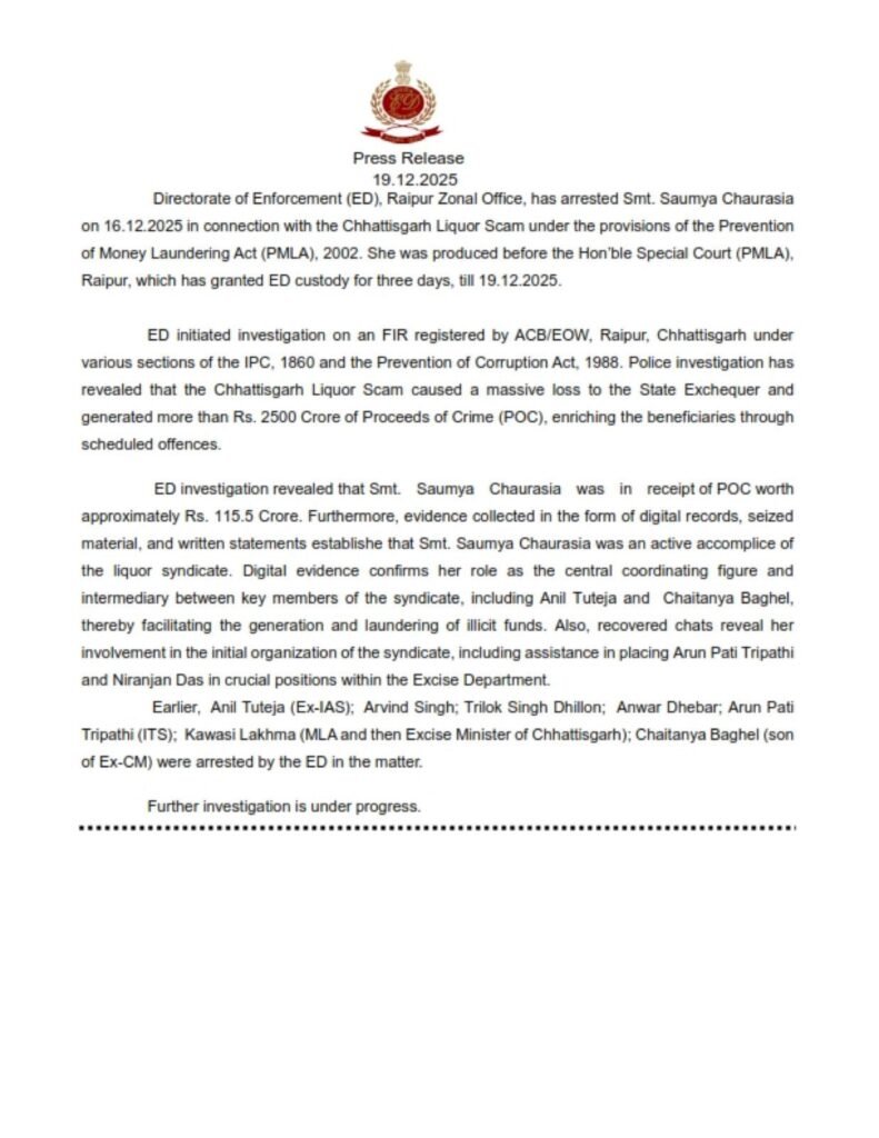 ईडी ने सौम्या चौरसिया को विशेष न्यायालय (पीएमएलए), रायपुर में पेश किया, जहां से उन्हें 19 दिसंबर 2025 तक तीन दिनों की ईडी हिरासत में भेजा गया।