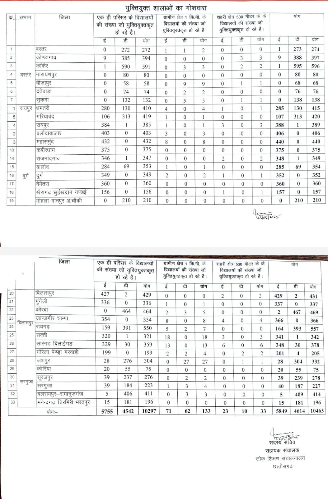 युक्तियुक्तकरण को लेकर चल रहे बातों को विराम देते हुए स्कूल शिक्षा विभाग ने आखिरकार आज इस संबंध में आदेश जारी कर दिया। जिलों से प्राप्त प्रस्ताव के आधार पर लोक शिक्षण संचालनालय द्वारा प्रस्तुत प्रस्ताव को मान्य करते हुए विभाग ने ई-संवर्ग के 5849 एवं टी-संवर्ग के 4614 शाला मिलाकर कुल 10463 शालाओं के युक्तियुक्तकरण करने का निर्णय लेते हुए इसे तत्काल प्रभाव से लागू कर दिया है।