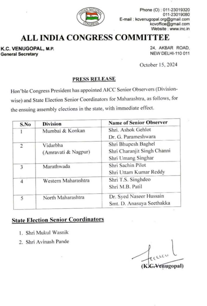 रायपुर। चुनाव आयोग के महाराष्ट्र और झारखंड के चुनाव की घोषणा के एक घंटे पहले कांग्रेस ने महाराष्ट्र में पाँच इलाक़ों के लिए 11 पर्यवेक्षक नियुक्त कर दिये हैं।