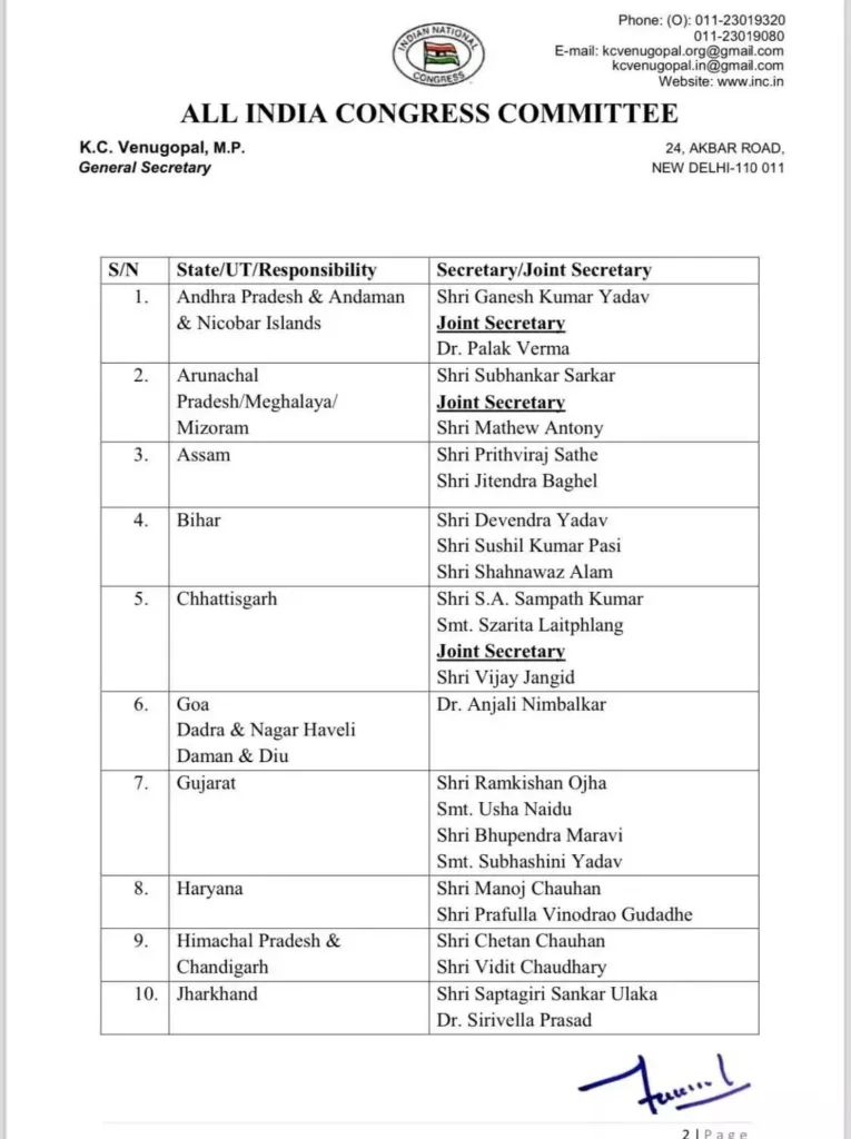 रायपुर : अखिल भारतीय कांग्रेस कमेटी ने अलग-अलग राज्यों में प्रदेश प्रभारी महासचिव के साथ सचिव और संयुक्त सचिवों की नियुक्ति की है।