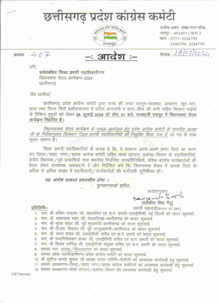 इसके साथ ही सभी पदाधिकारियों को निर्देश दिए गए हैं कि वे तत्काल बैठक कर तैयारियों का जायजा लें और सुनिश्चित करें कि उनके जिले से अधिकतम कार्यकर्ता घेराव में शामिल हों।