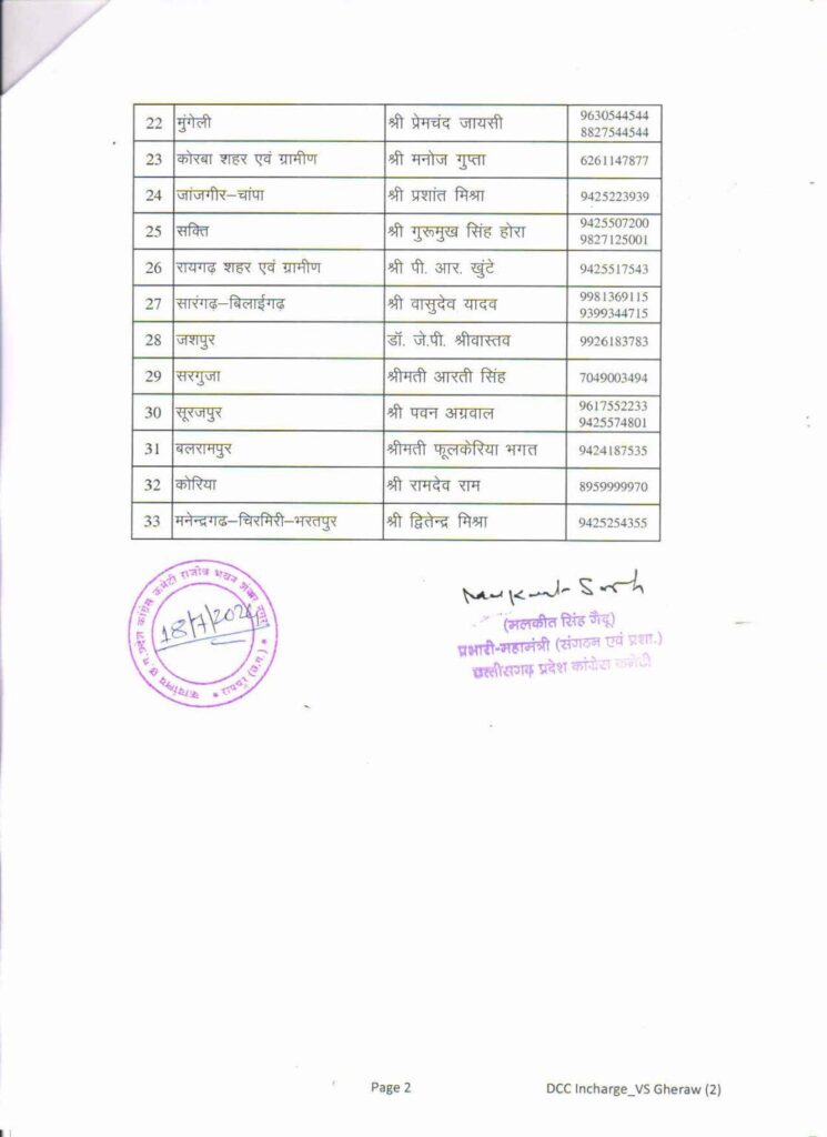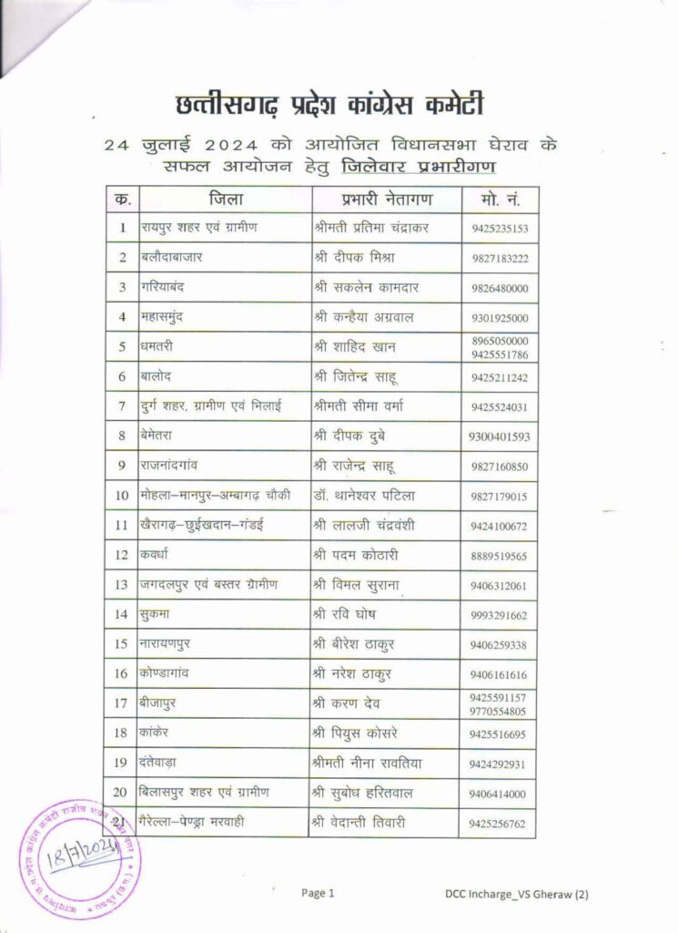 रायपुर। कांग्रेस ने विधानसभा घेराव की तैयारियों को तेज़ कर दिया है। इस सिलसिले में प्रदेश कांग्रेस कमेटी ने ज़िला स्तर पर विभिन्न नेताओं को जिम्मेदारी सौंपी हैं। इसी कड़ी में रायपुर जिले की जिम्मेदारी उपाध्यक्ष प्रतिमा चंद्राकर को दी गई है, जबकि बिलासपुर जिले की जिम्मेदारी प्रदेश महामंत्री सुबोध हरितवाल को सौंपी गई है।