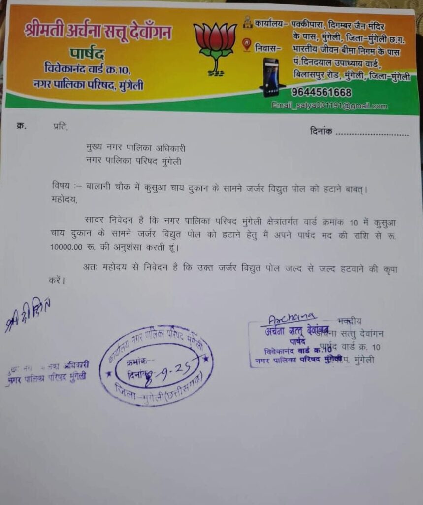 विवेकानंद वार्ड पार्षद अर्चना सत्तू देवांगन ने बालानी चौक में स्थित जर्जर विद्युत पोल को हटाने की दिशा में कदम बढ़ाते हुए नगर पालिका पार्षद मद से 10,000 रुपये की अनुशंसा प्रदान की है। इस संबंध में पार्षद प्रतिनिधि सत्तू देवांगन ने जानकारी देते हुए बताया कि मुख्य नगरपालिका अधिकारी को पत्र लिखकर इस पोल को तत्काल हटाने की मांग की गई है। पत्र में स्पष्ट उल्लेख किया गया है कि कुसुवा चाय दुकान के सामने वर्षों से खड़ा यह पोल कभी भी गिर सकता है और राहगीरों व आसपास के निवासियों की जान को खतरा है।