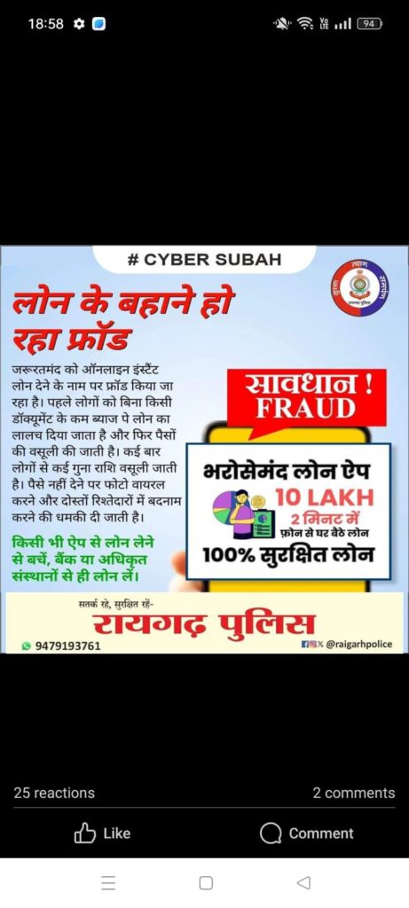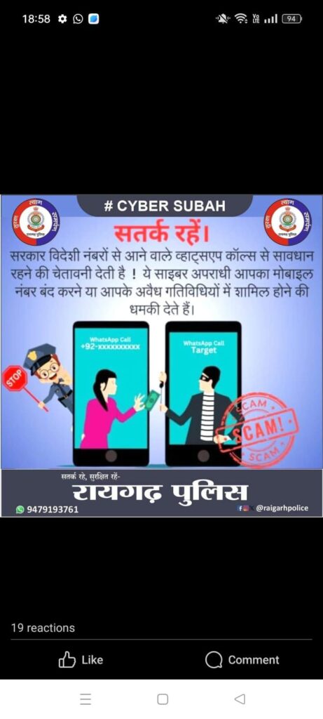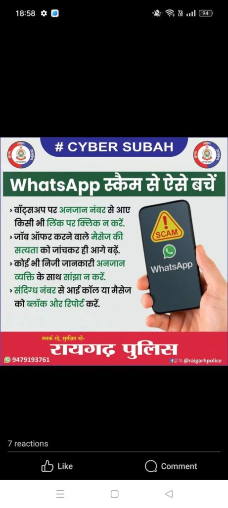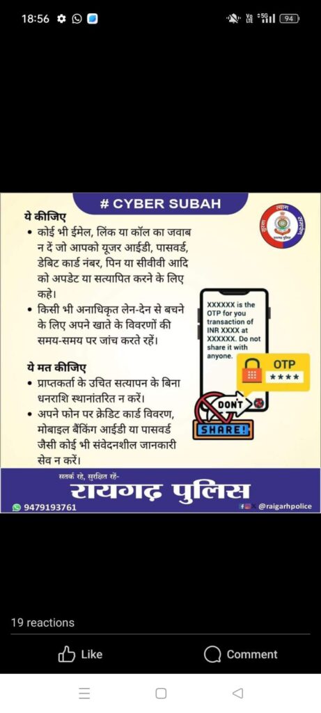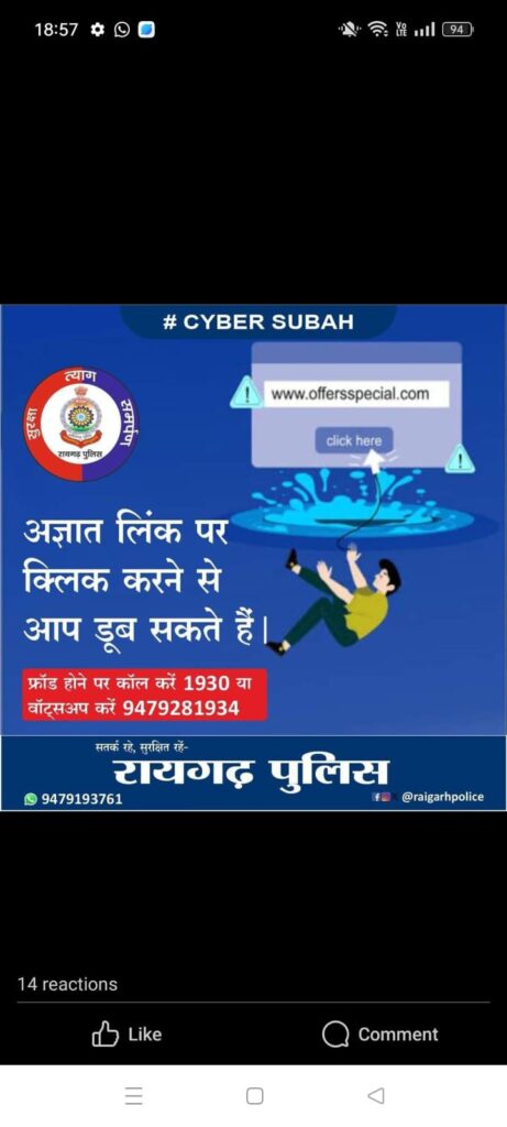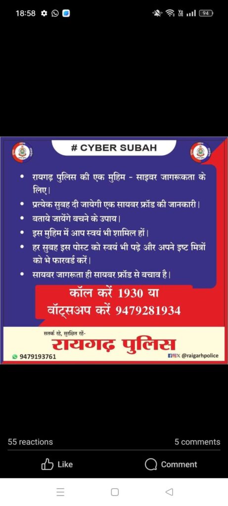 साइबर सुरक्षा हमारे सामूहिक प्रयास पर निर्भर करती है। रायगढ़ पुलिस इस अभियान के माध्यम से आपके डिजिटल जीवन को सुरक्षित बनाने के लिए प्रतिबद्ध है।