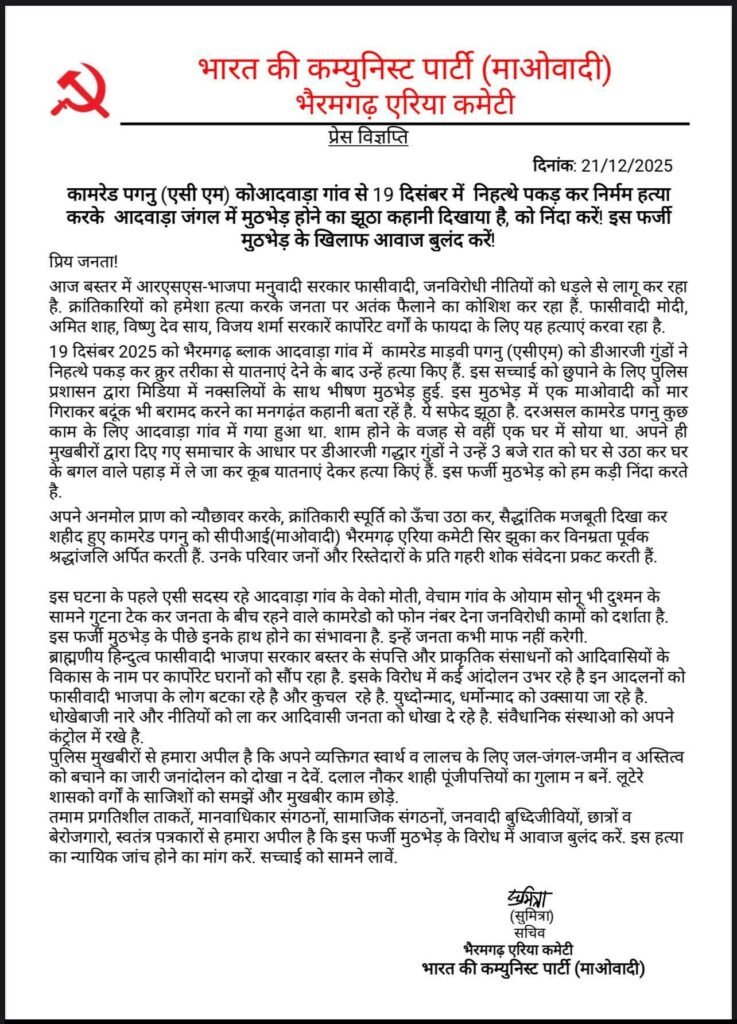 छत्तीसगढ़ के बस्तर संभाग अंतर्गत भैरमगढ़ ब्लॉक के आदवाड़ा गांव में 19 दिसंबर को हुई एक मुठभेड़ को लेकर नक्सली गंभीर सवाल खड़े कर रहे हैं। मृतक की पहचान माड़वी पगनु के रूप में हुई है, जिन्हें पुलिस ने मुठभेड़ में मारे जाने का दावा किया है।