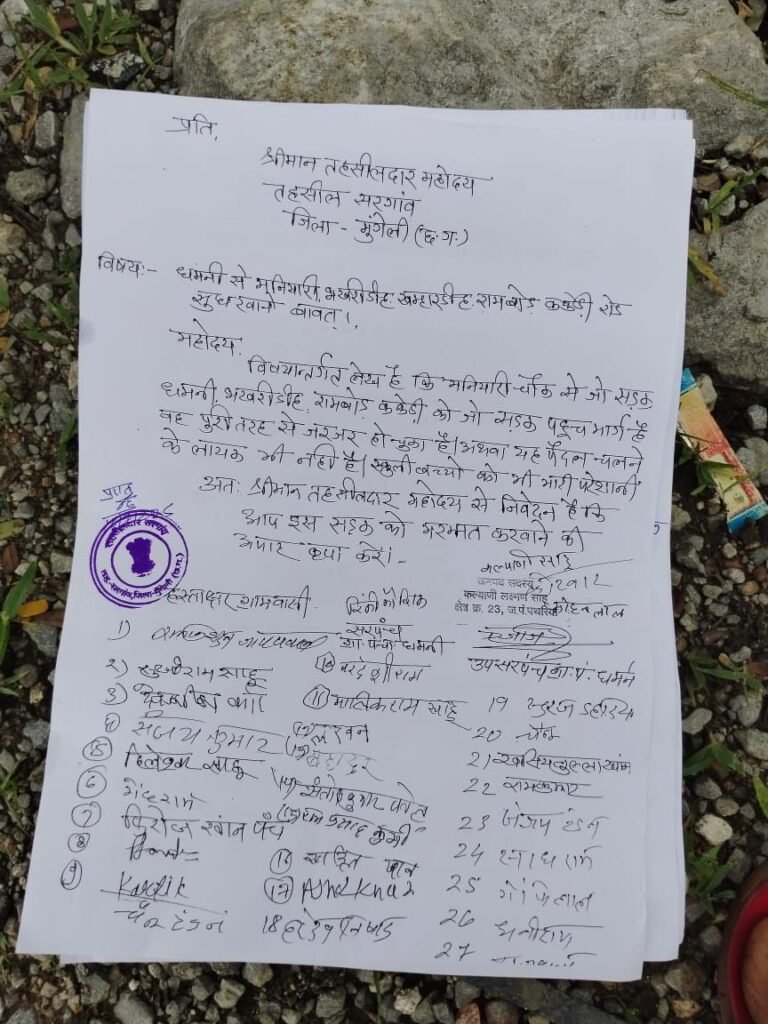 धमनी व रामबोड पहुंच मार्ग अत्यधिक जर्जर और खतरनाक है जिससे ग्रामीणों को शिक्षा व स्वास्थ्य,राशन के लिए आनेजाने में भारी समस्याओ से गुजरना पड़ रहा है इसके लिए तहसीलदार सरगांव अतुल वैष्णव को ज्ञापन सौंपा गया है।