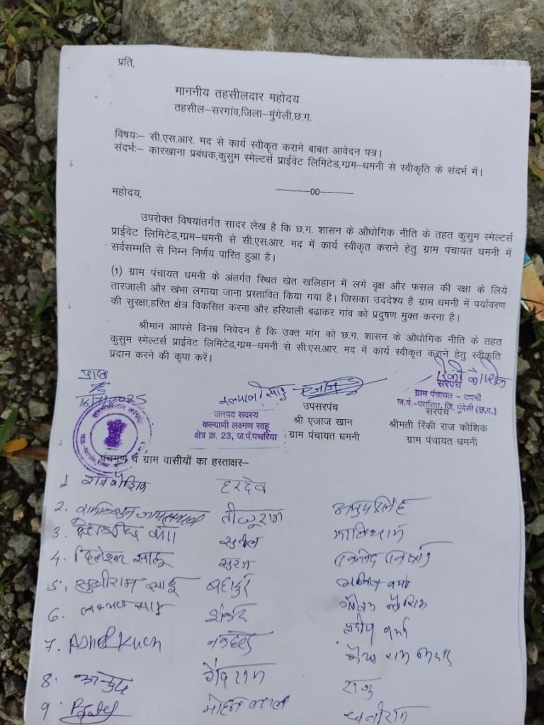 सरगांव – ग्राम पंचायत धमनी में ग्राम विकास को लेकर एक नई जागरूकता की लहर देखने को मिल रही है। ग्राम सरपंच श्रीमती रिंकी राज कौशिक व उपसरपंच श्री एजाज अली के नेतृत्व में धमनी के पंचगणों और ग्रामीणों ने कुसुम स्लैमटर्स प्राइवेट लिमिटेड फैक्ट्री के प्रबंधन से सीधे संवाद स्थापित करते हुए मांग रखी कि कंपनी अपने कुल वार्षिक आय का कम से कम 2% हिस्सा कॉर्पोरेट सोशल रिस्पॉन्सिबिलिटी (CSR) मद के अंतर्गत ग्राम विकास के कार्यों में व्यय करे। इस मांग को लेकर ग्राम धमनी के 150 से अधिक ग्रामीणों ने एकत्रित होकर संयमित, शांतिपूर्ण व संगठित तरीके से फैक्ट्री पहुँचकर अपनी बात रखी।