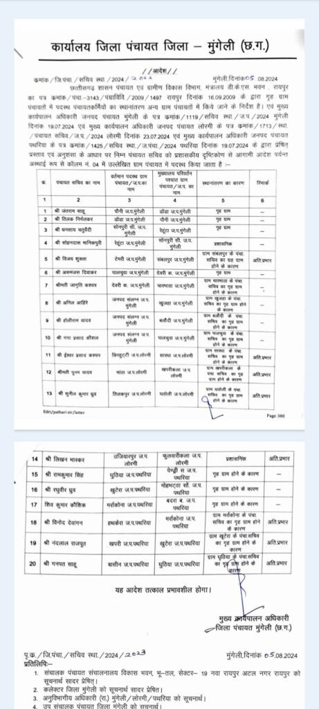मुंगेली : शासन के निर्देशानुसार जिले के 20 पंचायत सचिवों का आज स्थानांतरण किया गया है।