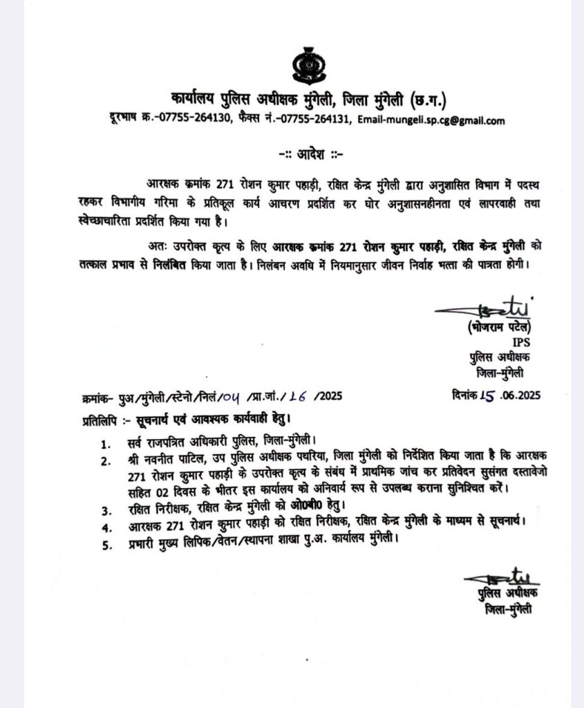 मुंगेली। पुलिस अधीक्षक भोजराम पटेल (भा.पु.से.) के निर्देश पर ड्यूटी में लापरवाही एवं अनुशासनहीनता बरतने वाले आरक्षक को तत्काल प्रभाव से निलंबित कर विभागीय जांच के आदेश जारी किए गए हैं।
