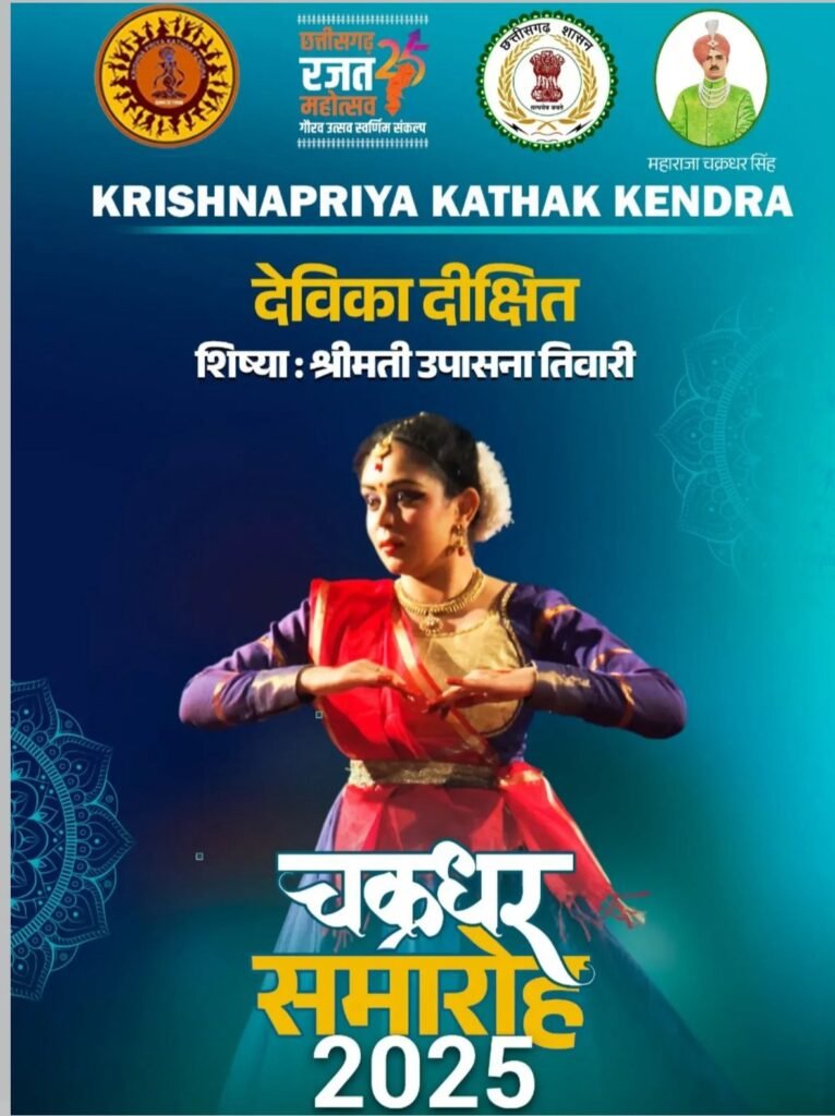 चक्रधर समारोह 2025 का मंच सोमवार की रात उस समय गूंज उठा जब दुर्ग की युवा कथक नृत्यांगना देविका दीक्षित ने अपनी मनमोहक प्रस्तुति दी। लगभग चौबीस वर्षों की साधना से तराशी गई उनकी कला ने दर्शकों को परंपरा और आधुनिकता का अद्भुत संगम दिखाया। भाव, लय और ताल की उत्कृष्टता से सजी इस प्रस्तुति ने दर्शकों को क्षणभर के लिए सम्मोहित कर लिया।