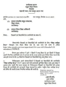 छत्तीसगढ़ में अब स्कूलों में शिक्षकों और विद्यार्थियों की उपस्थिति ऑनलाइन दर्ज करना अनिवार्य कर दिया गया है। इस संबंध में स्कूल शिक्षा विभाग, मंत्रालय द्वारा औपचारिक आदेश जारी किए गए हैं। यह आदेश प्रदेश के सभी संभागीय संयुक्त संचालकों और जिला शिक्षा अधिकारियों को भेजा गया है।