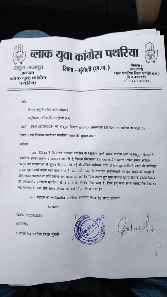 विदित हो कि क्षेत्र मे बिजली की समस्या अपने चरम पर है, जिसे लेकर सोमवार के दिन युवा कांग्रेस द्वारा एसडीएम पथरिया को ज्ञापन सौपा गया था। ज्ञापन मे नगर पंचायत पथरिया के विभिन्न वार्डो औऱ ग्रामीण अंचल के लगभग 50 गांवों मे विद्युत विभाग सम्बन्धी समस्याओ का ज़िक्र किया गया औऱ नियत समय तक इन्हे दुरुस्त करने की मांग की गई औऱ मांग पूरी नही होने पर एसडीएम कार्यालय घेराव की चेतावनी दी गई थी। इसी क्रम मे अब गुरुवार को एसडीएम कार्यालय का घेराव करना तय किया गया है।