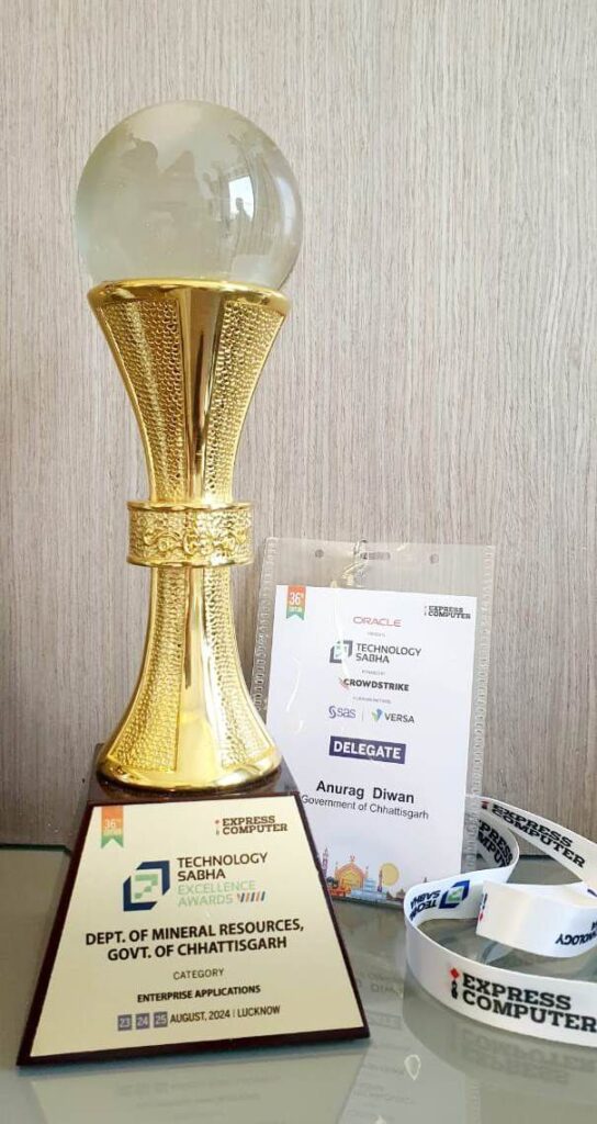 वर्ष 2018-19 में खनिज ऑनलाईन परियोजना को शासकीय प्रक्रिया एवं व्यवस्था का डिजिटल ट्रांसफोर्मेशन के माध्यम से रि-इंजीनियरिंग करने हेतु किये गये पहल एवं क्रियान्वयन में उत्कृष्टता को पहचान एवं बढ़ावा देने हेतु भारत सरकार द्वारा नेशनल अवार्ड फॉर ई-गवर्नेस भी दिया गया है।