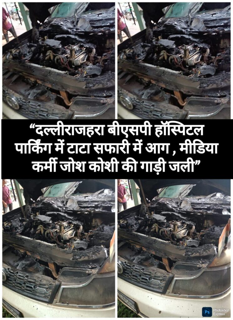 “दल्लीराजहरा बीएसपी हॉस्पिटल पार्किंग में टाटा सफारी में आग — मीडिया कर्मी जोश कोशी की गाड़ी जली”