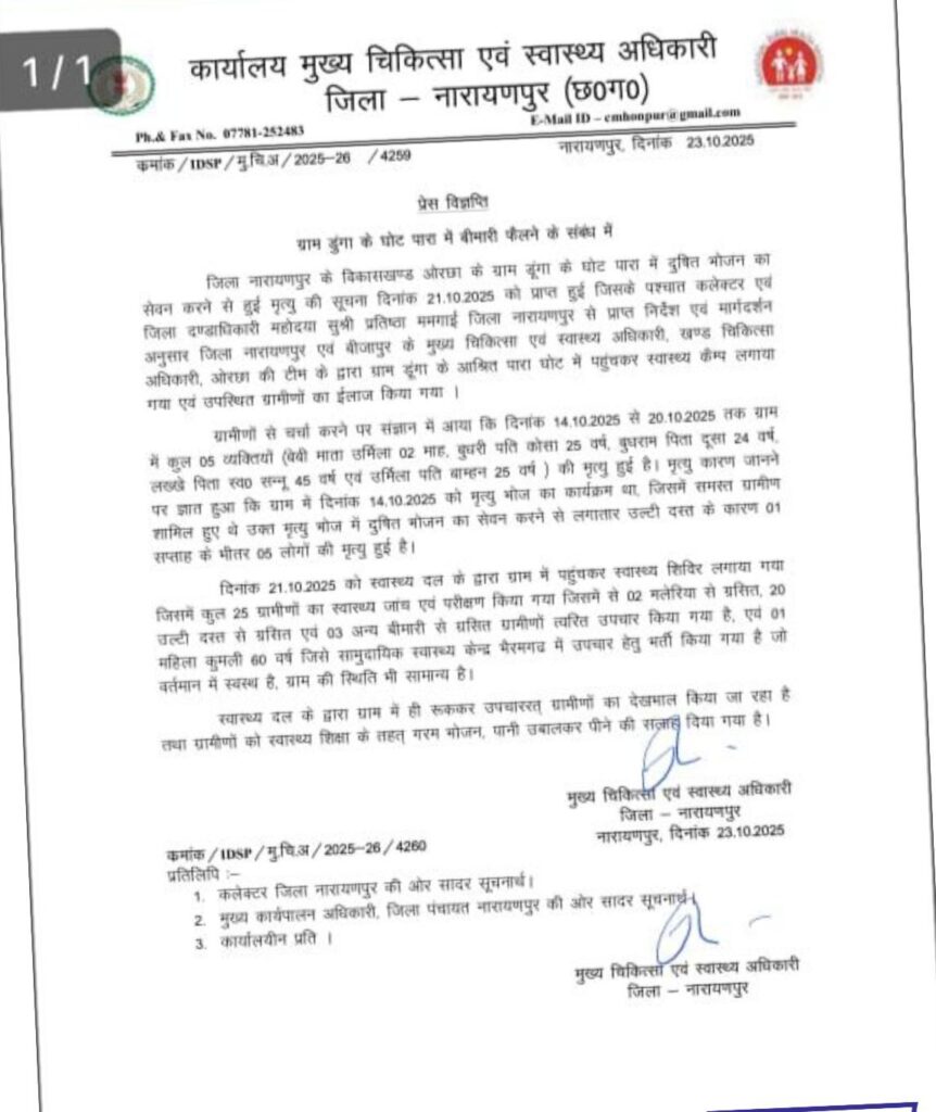 नारायणपुर और बीजापुर जिले की सीमा पर स्थित अबूझमाड़ के एक गांव में तेरहवीं के भोज के दौरान परोसे गए भोजन से फूड पॉइजनिंग का मामला सामने आया है। इस घटना में अब तक पांच ग्रामीणों की मौत हो चुकी है, जबकि 20 से अधिक लोग बीमार हैं।