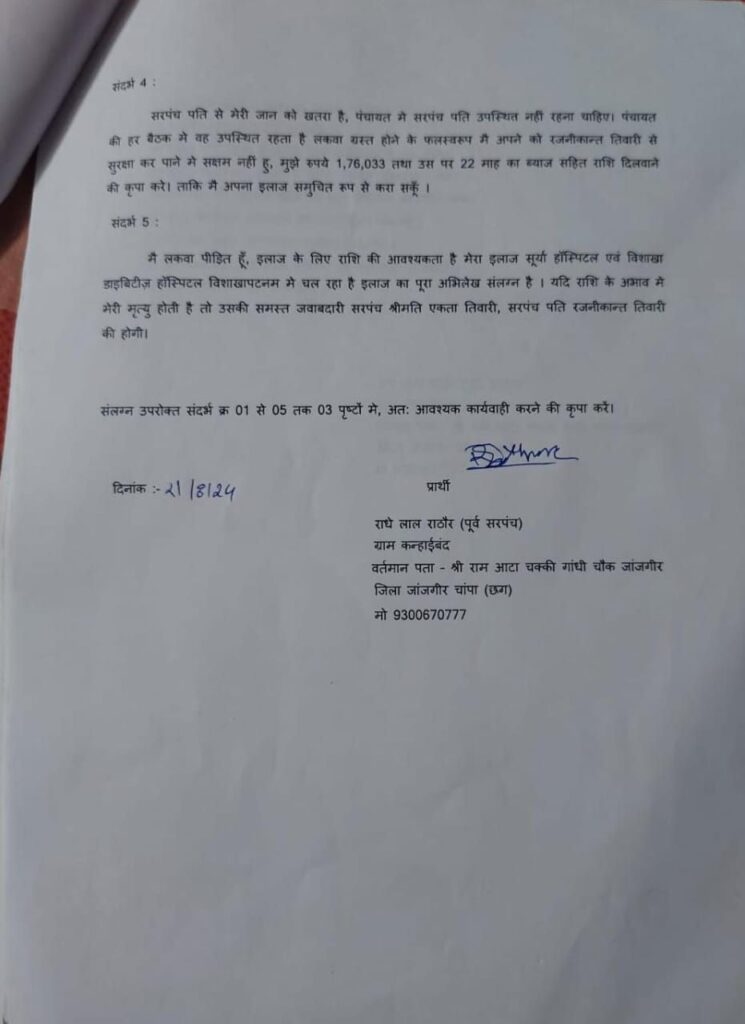 सरपंच श्रीमति एकता तिवारी के पति रजनीकान्त तिवारी जो वर्तमान में सेवा सहकारी समिति सिवनी में सेल्समैन पद पर कार्यरत है के द्वारा पंचायत का संचालन किया जा रहा हैं साथ ही सरपंच पति पंचायत के हर बैठक में वह उपस्थित रहता है लकवा ग्रस्त होने के फलस्वरूप मैं अपने आपको सरपंच पति रजनीकान्त तिवारी से ग्राम पंचायत के अंदर सुरक्षा कर पाने में सक्षम नहीं हूँ। श्री राठौर ने अपने कार्यकाल में किये गये कार्यों की भुगतान एक लाख 76 हजार 33 रुपये तथा उस पर 22 माह का ब्याज सहित राशि दिलवाने की मांग की हैं।
