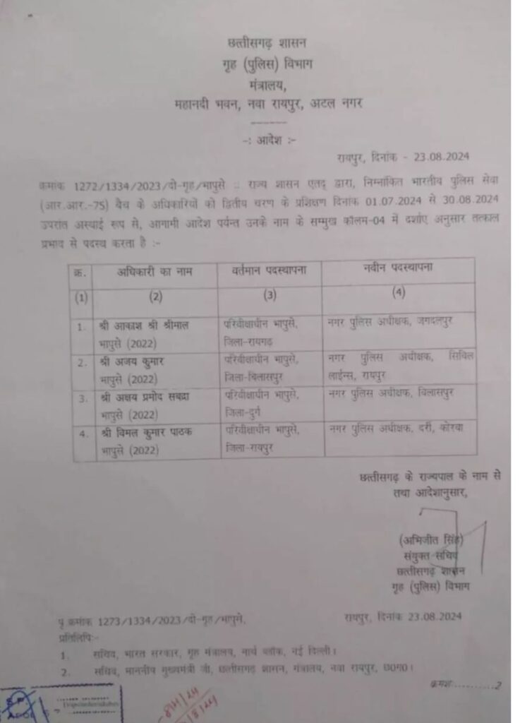 जारी किए गए आदेश के अनुसार 2022 बैच के आकाश श्रीमाल को जगदलपुर, अजय कुमार को सिविल लाइन रायपुर, अक्षय प्रमोद को नगर पुलिस अधीक्षक बिलासपुर, विमल कुमार पाठक को सीएसपी दर्री बनाया गया है।