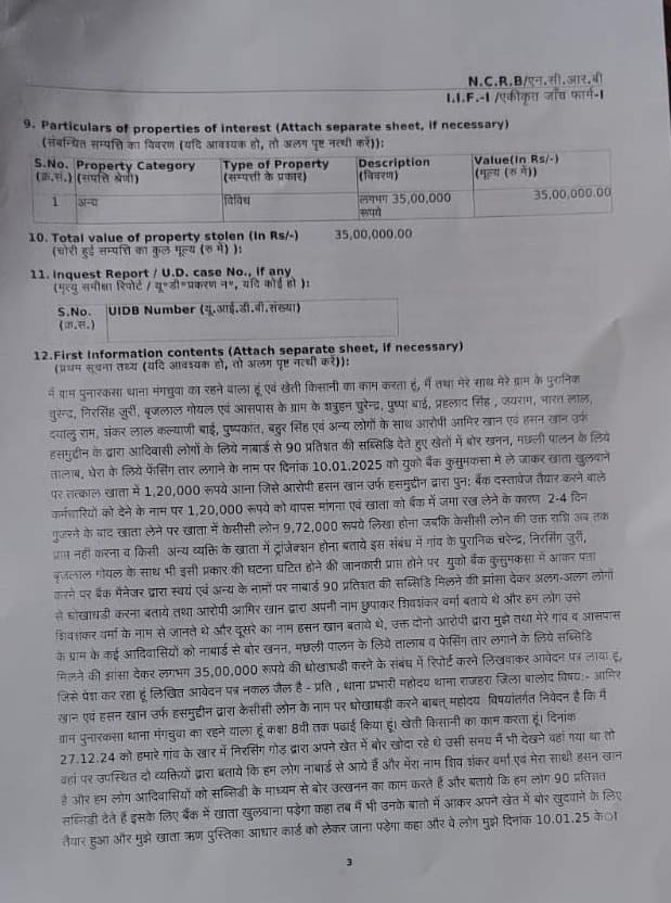कैसे हुई ठगी?,,पीड़ित कृषकों ने बताया कि जनवरी-फरवरी माह में कुछ लोग उनके गांव पहुंचे और स्वयं को नाबार्ड का अधिकारी बताकर सोलर प्लेट, बोर, फेंसिंग और ट्रैक्टर दिलाने का लालच दिया। कम ब्याज दर और 80-90% सब्सिडी का झांसा देकर उनसे खेत का पट्टा और आधार कार्ड लेकर विभिन्न बैंकों में लोन का फॉर्म भरवाया। किसानों के खाते में 5 से 12 लाख तक की राशि आई, लेकिन पूरी रकम बिना जानकारी के निकाल ली गई। जब किसानों ने तथाकथित अधिकारियों से संपर्क करना चाहा तो वे लगातार गुमराह करते रहे और बाद में मोबाइल फोन बंद कर दिया।